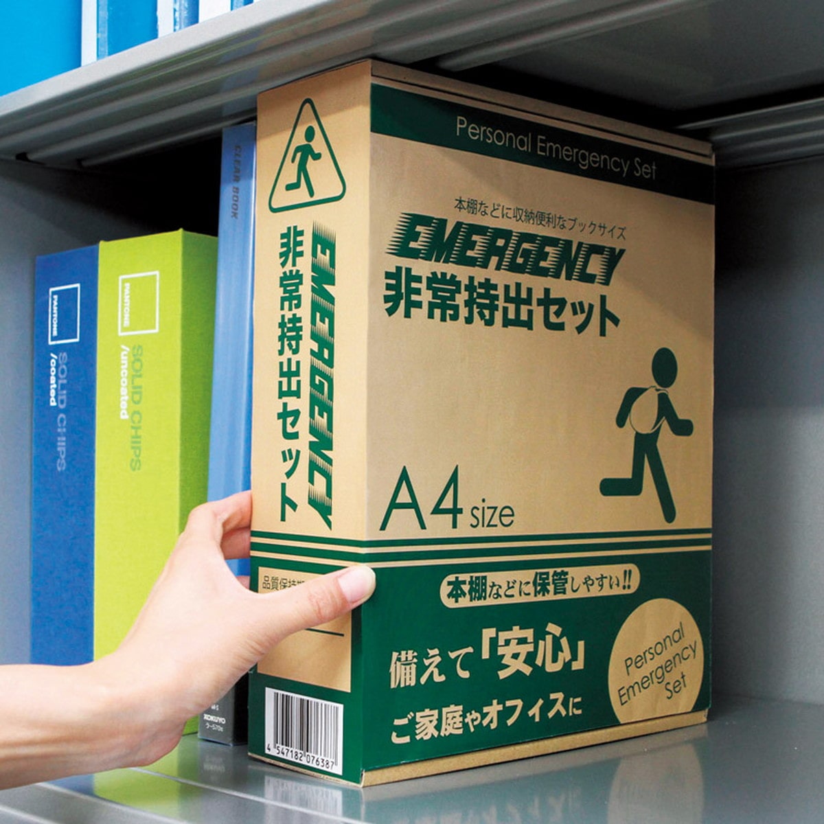 「非常持出17点セット BT-40」 棚や引き出しに常備しやすい帰宅支援を意識したセット。A4収納箱タイプ。