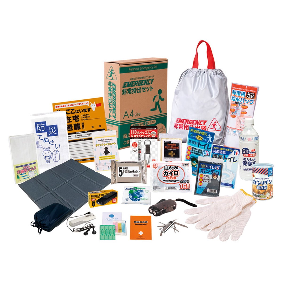 ●数量・内容:非常持出袋(約340×390mm)×1、防災の心得・IDホイッスル&カラビナリング・カイロ・レインコート・携帯用トイレ・抗菌消臭簡易トイレ・トイレポンチョ・ダイナモLEDライト・モバイルバッテリー(乾電池式)・FMラジオ・軍手・アルミブランケット・防災てぬぐい・マスク・ウェットティッシュ・クッションシート・5年保存水(約500ml)・カンパン・8徳ナイフ・給水袋(3リットル)・緊急避難カード・水に流せるペーパー・綿棒&絆創膏×各1