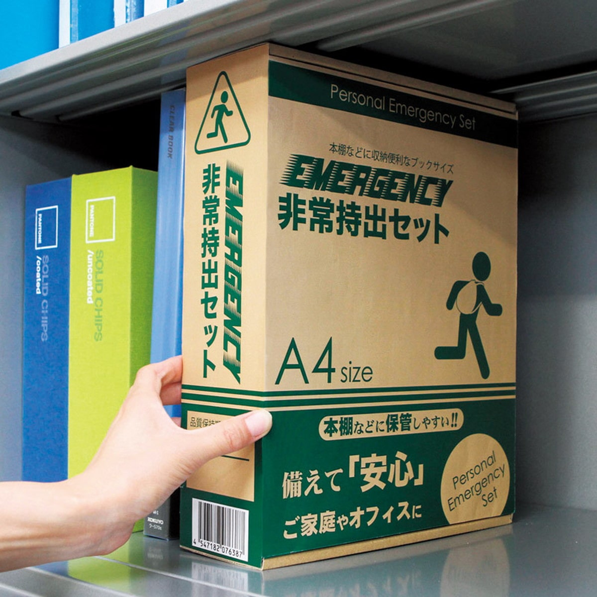 「非常持出セット24点セット BT-70」 棚や引き出しに常備しやすい帰宅支援を意識したセット。A4収納箱タイプ。