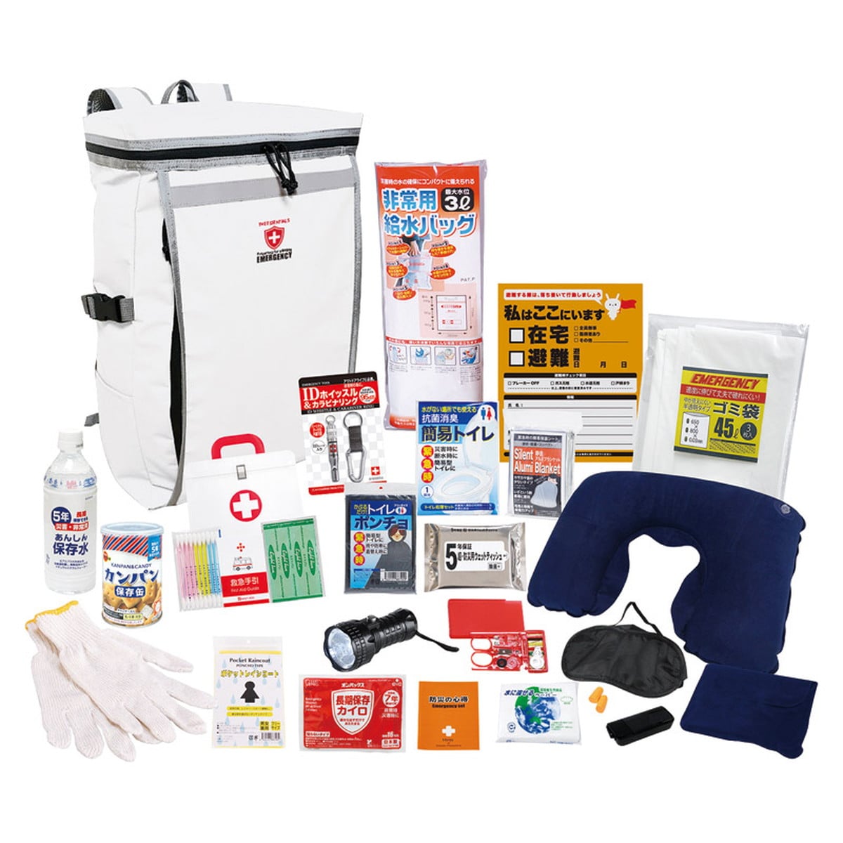 ●数量・内容:収納リュック(約180×300×470mm)×1、防災の心得・IDホイッスル&カラビナリング・カイロ・レインコート・抗菌消臭トイレ・トイレポンチョ・モバイルバッテリー(乾電池式)・軍手・静音アルミブランケット・懐中電灯・ウェットティッシュ・ネックピロー・アイマスク・耳栓・給水袋(3リットル)・5年保存水(500ml)・カンパン・ソーイングセット・緊急避難カード・水に流せるペーパー・救急4点セット・45リットルゴミ袋(3P)×各1