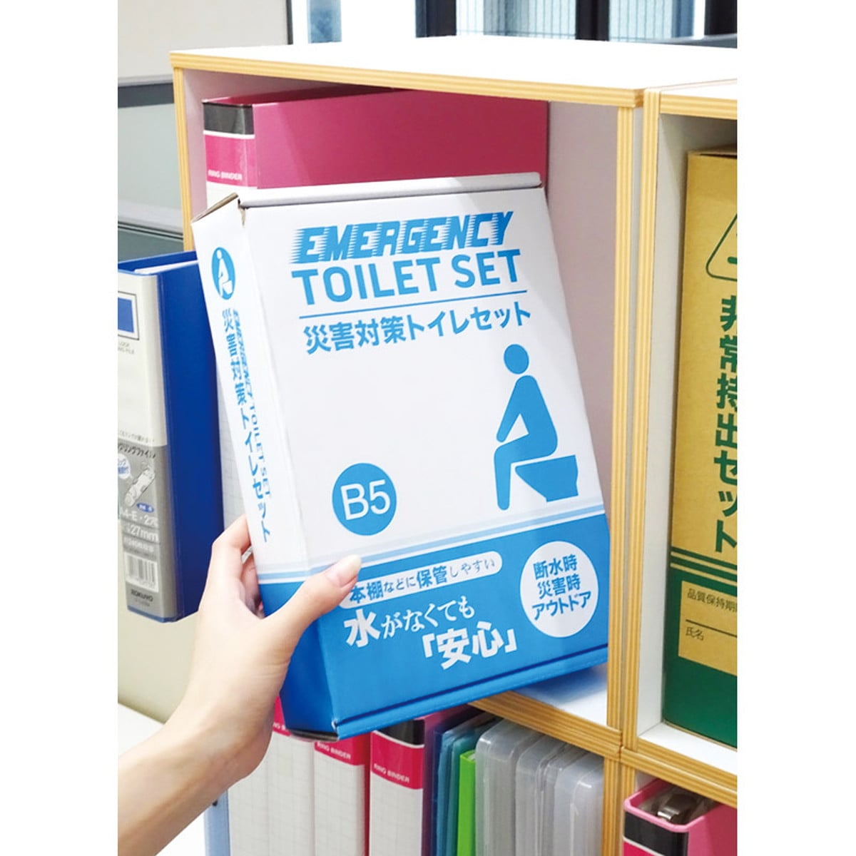 「災害対策トイレセット10回分 TM-20G」 コンパクトに備蓄可能なトイレ処理キット。B5ファイルボックスサイズで棚や引き出しに常備しやすい。断水時にも便座に袋をセットし、使用後に凝固剤を振りかけるだけで排泄物の処理が可能。可燃ごみとして廃棄できます。