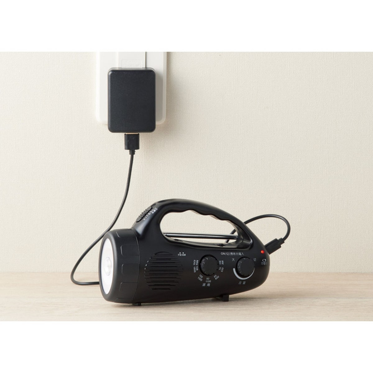 「スマホ対応ダイナモハンディラジオライト」 付属のUSB蓄電ケーブルを使用し、本体蓄電可能です。●手回し充電機能付●ライト●AM/FMラジオ●サイレン●スマホ充電
