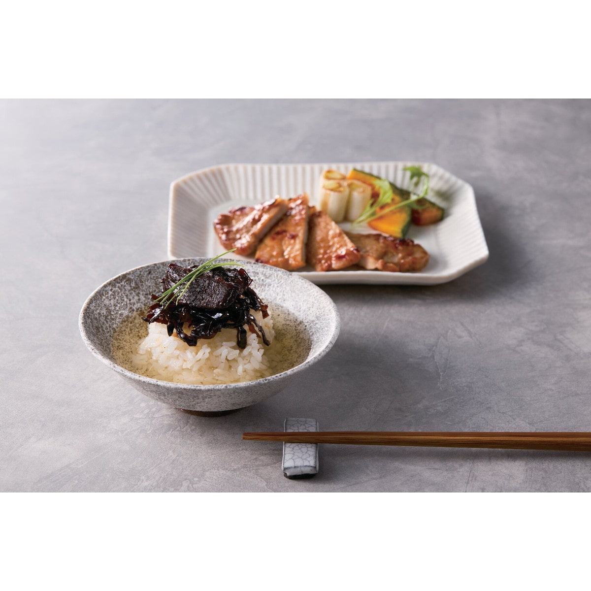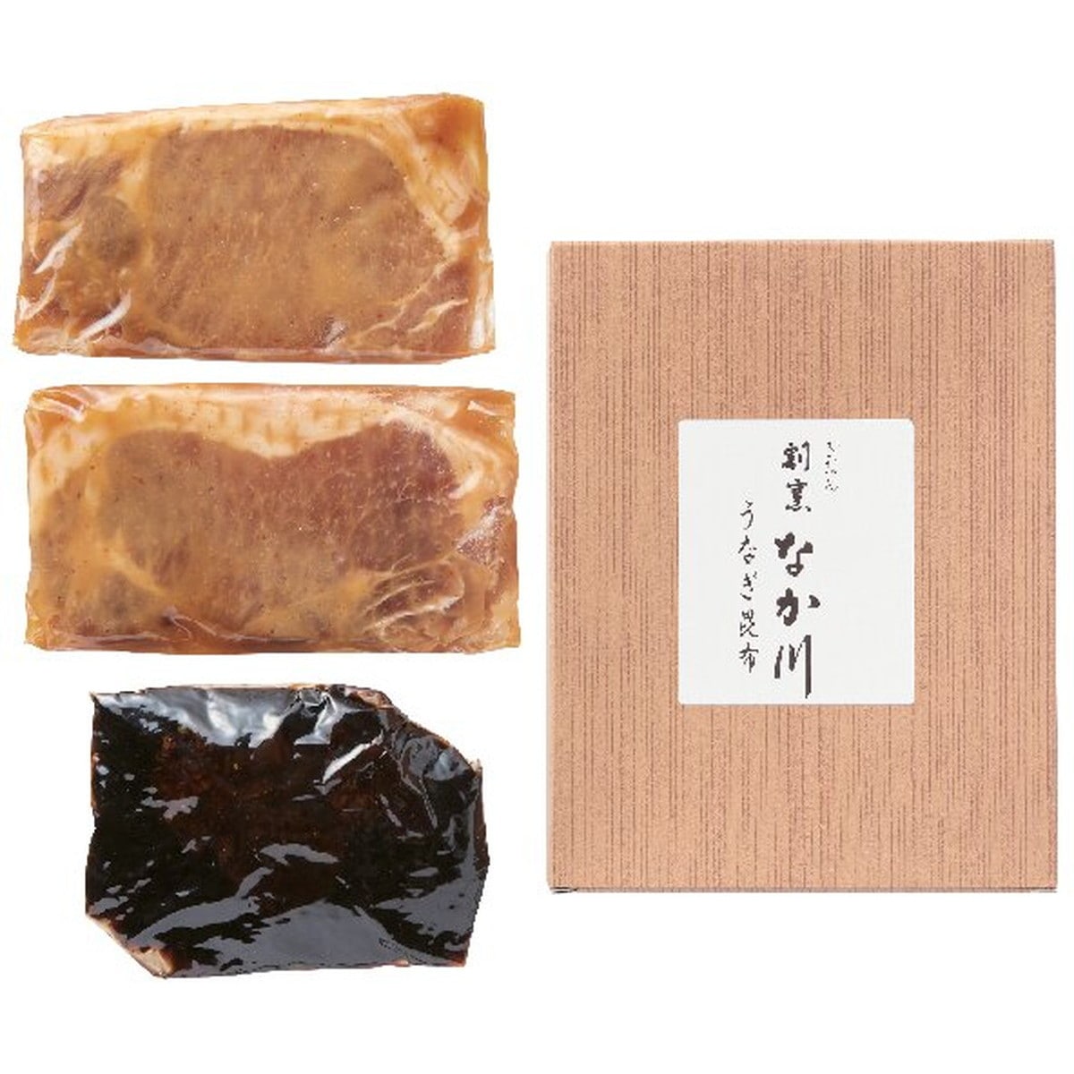 「<ぎおん割烹なか川>うなぎ昆布と豚肉西京味噌仕立て」 京都西京味噌の味噌ダレを使用した国産豚肉とつまみや茶漬けでお楽しみいただけるうなぎ昆布とのセットです。