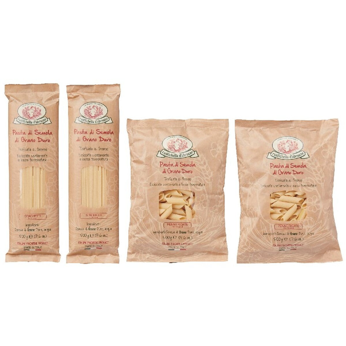 「ルスティケーラ パスタ2種セット」 デュラム小麦のセモリナをブロンズのダイスで打ち抜き長時間じっくり低温乾燥させています。コシのあるもちもちとした食感と、小麦の香りをしっかりとお楽しみいただけます。