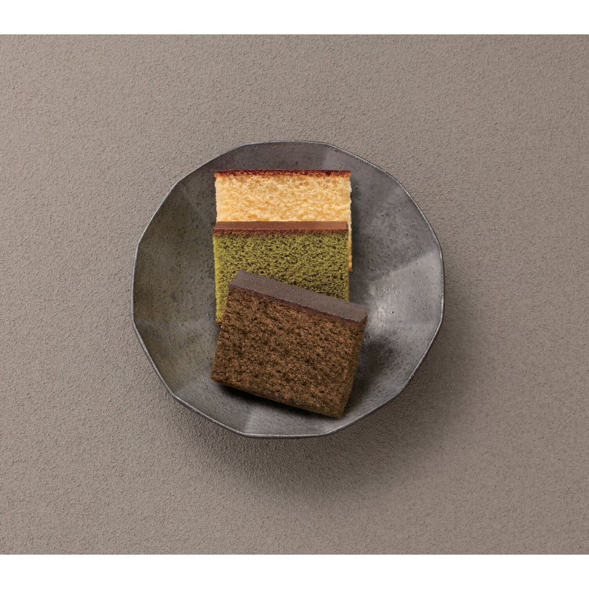 「カステーラ詰合せ」 素材の持つ力で自然に焼き上げたカステーラ。プレーンカステーラ、抹茶カステーラと『丸福珈琲店』こだわりの珈琲を使い、『長崎堂』の製法で焼き上げた珈琲カステーラとの詰合わせです。