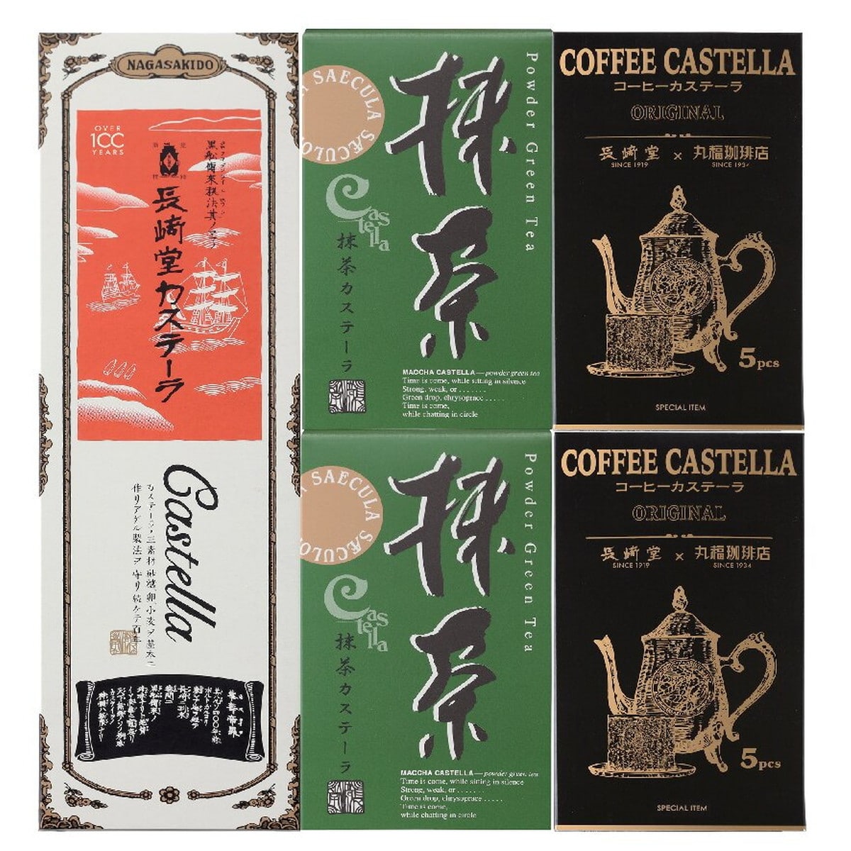 ●数量・内容:カステーラ(5切入×2袋)×1本、抹茶カステーラ(5切入)×2本、珈琲カステーラ(5切入)×2本