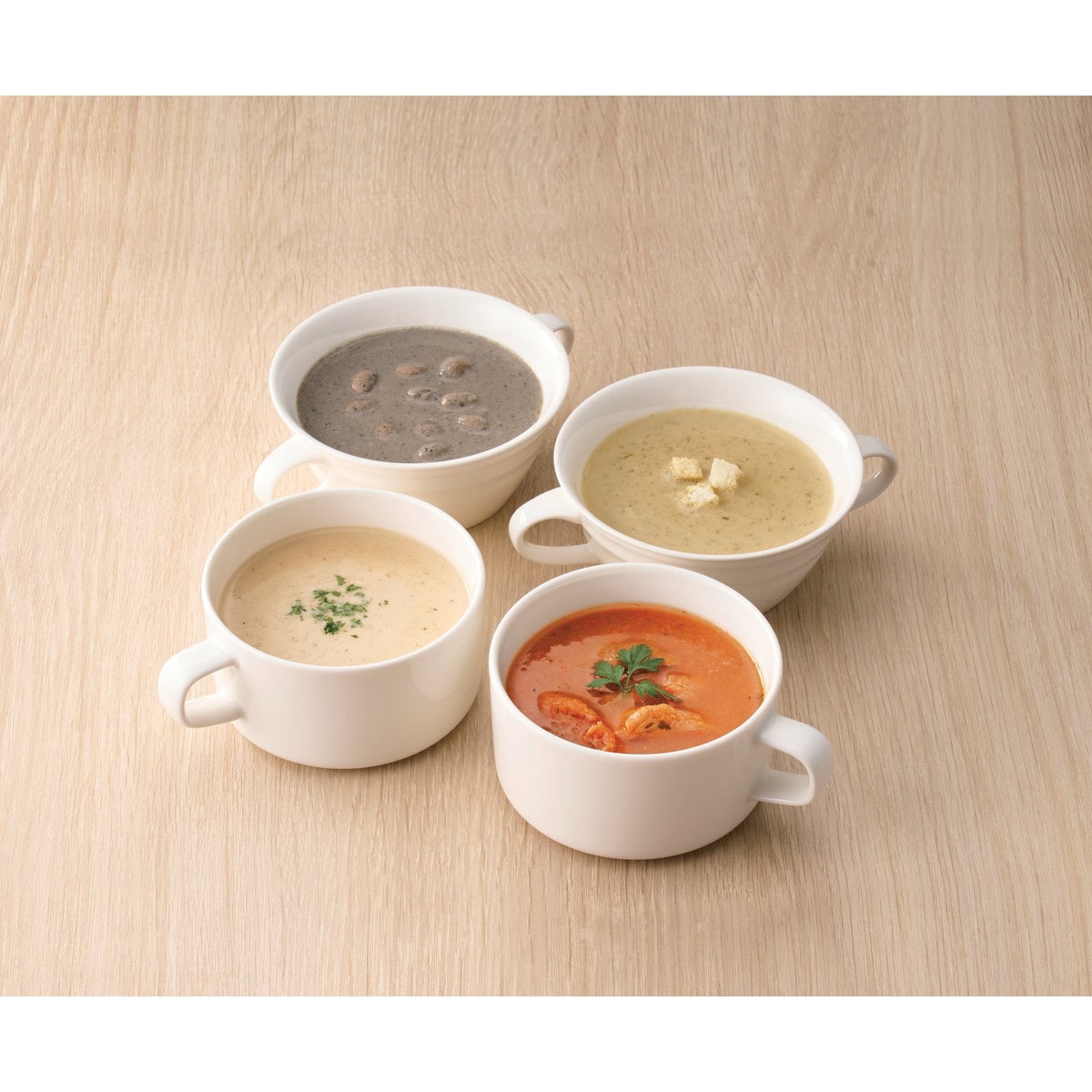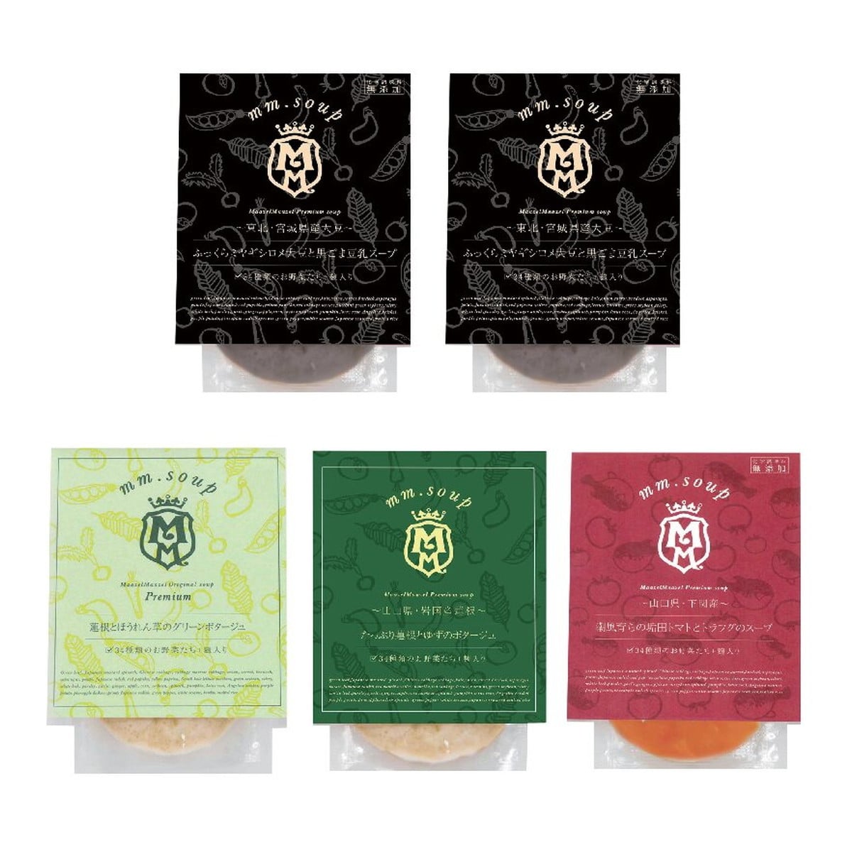 ●数量・内容:ふっくらミヤギシロメ大豆と黒ごま豆乳スープ180g×2、蓮根とほうれん草のグリーンポタージュ・たっぷり蓮根とゆずのポタージュ・潮風育ちの垢田トマトとトラフグのスープ各180g