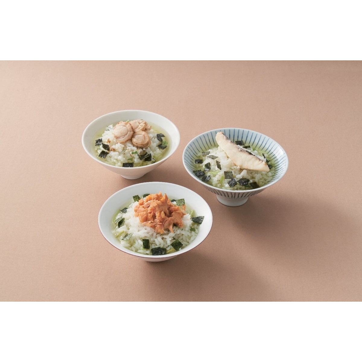 「贅沢だし茶漬けセット」 優しい味わいの真鯛、ほどよく脂が乗った銀鮭、柔らかく甘みのある帆立。3種のお茶漬けセットです。