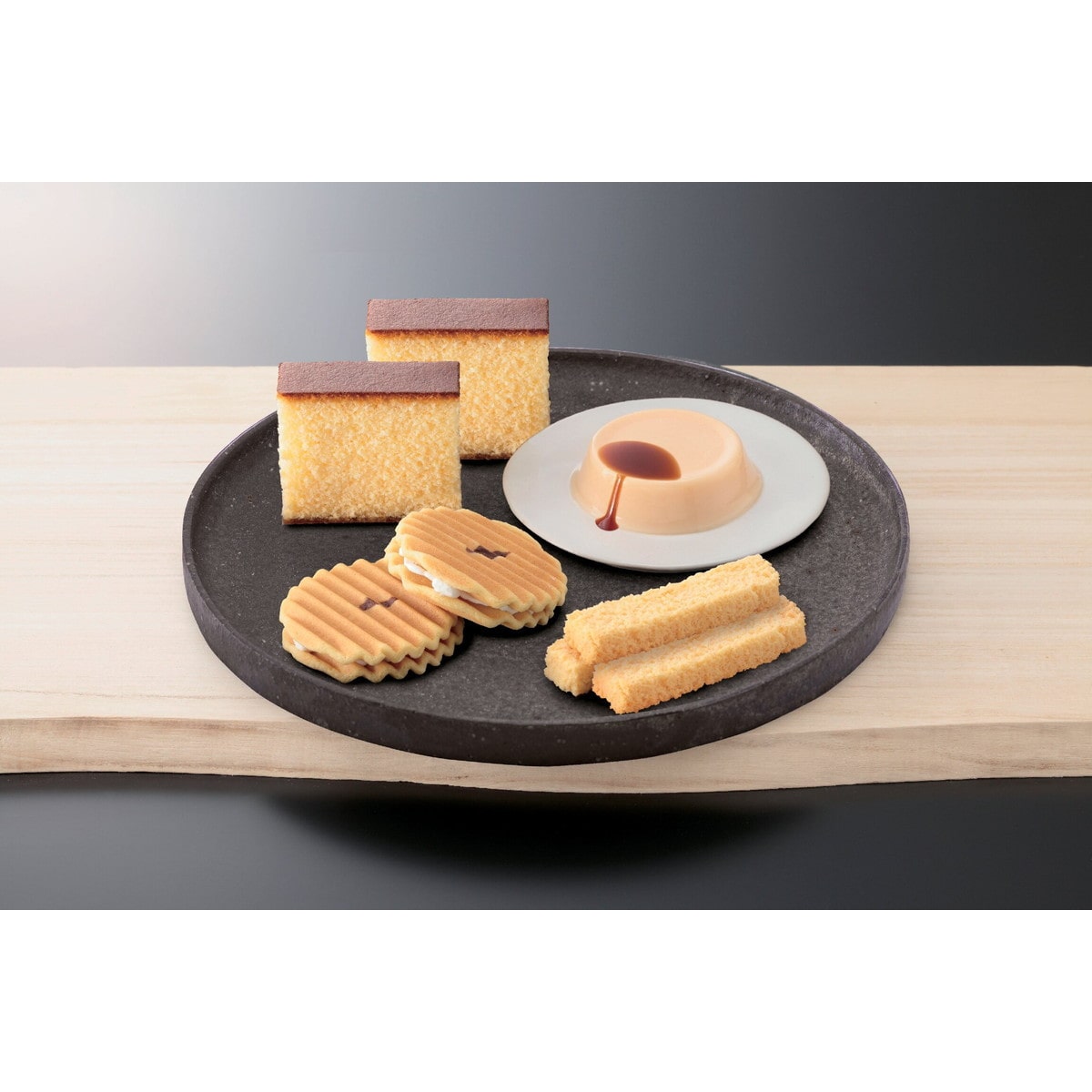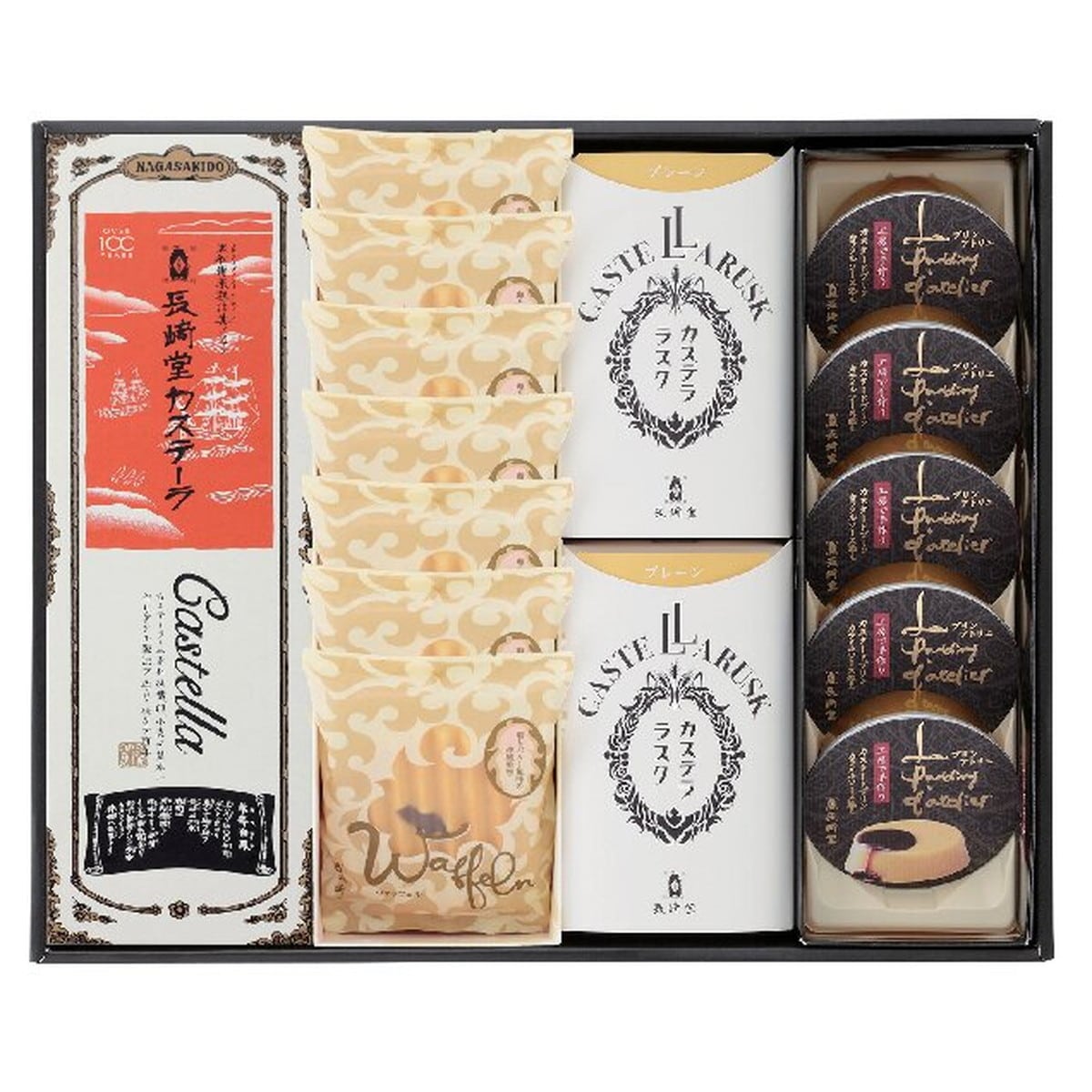●数量・内容:カステーラ(5切入×2袋)×1本、ヴァッフェル×7枚、カスタードプリン×5個、カステララスク×2箱