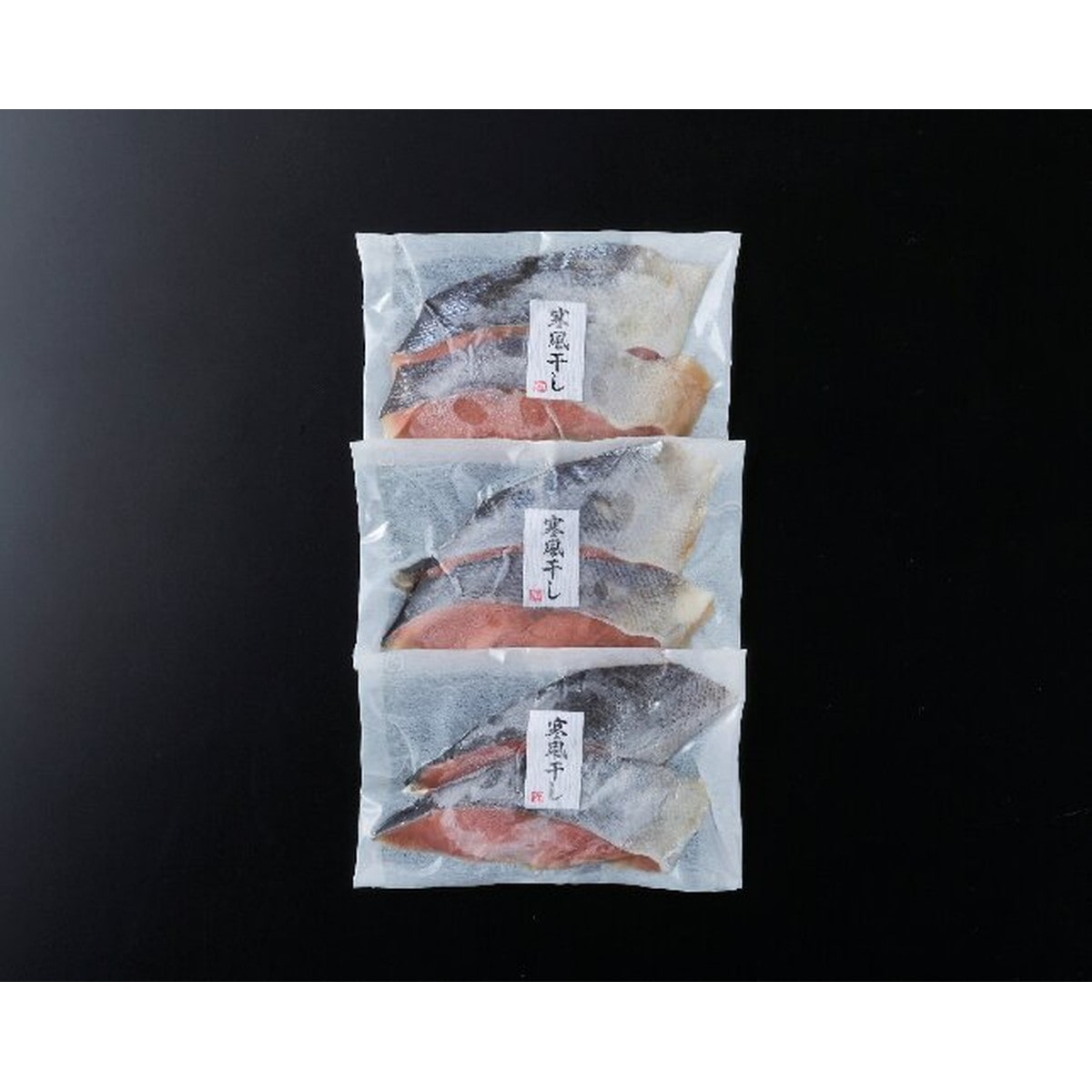 「北海道産秋鮭寒風干切身(中辛) 120g×3」 北海道産の秋鮭を塩漬けし熟成させた後、さらに寒風庫にて干していきます。寒風にさらされることでより旨みが引き出されています。
