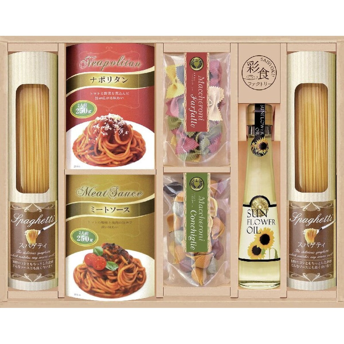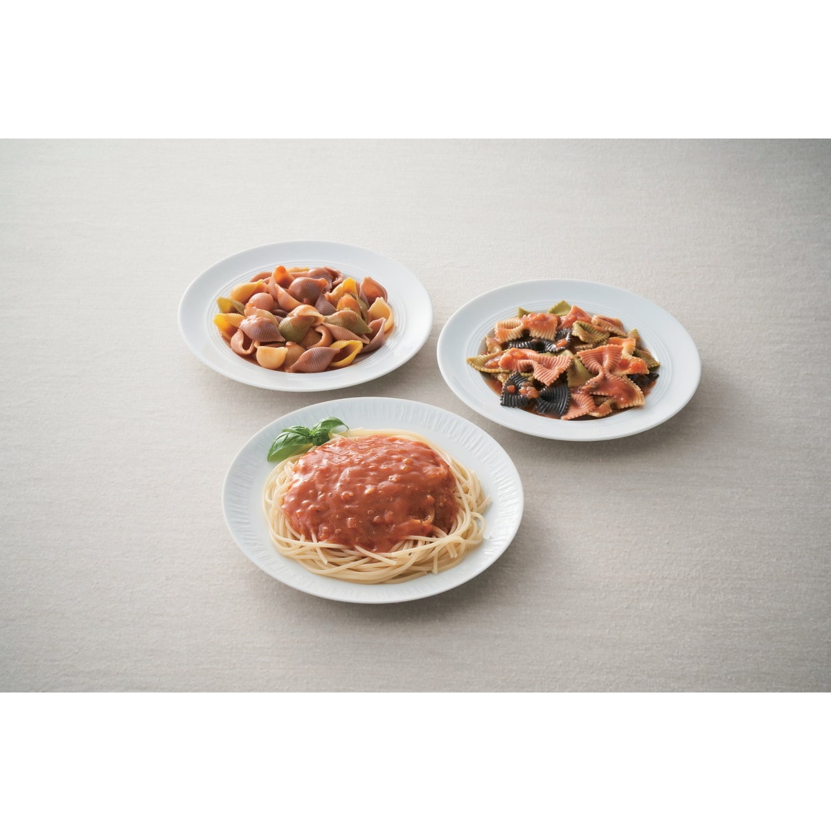 ●数量・内容:スパゲティ130g×2、自然色パスタコンキリエ60g、自然色パスタファルファーレ40g、ナポリタンソース・ミートソース各250g、ひまわりオイル110g