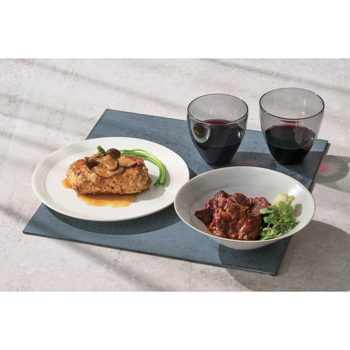 「<みのり>煮込みハンバーグ、牛肉蒸し煮」 ほんのりと甘みがある和風きのこ餡の煮込みハンバーグと、八丁味噌で煮込んだ牛肉に野菜の旨みが溶け込んだコク深い牛肉の蒸し煮のセットです。