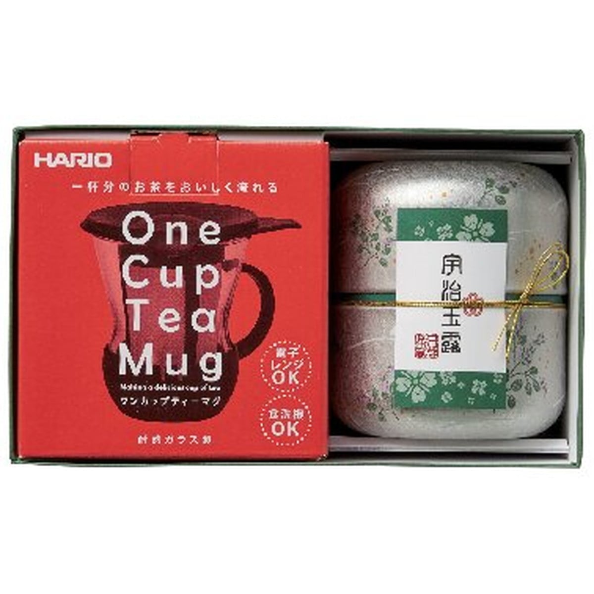 ●数量・内容:宇治玉露50g、HARIOティーマグ×1 ●サイズ/約高さ10.7×幅12×奥行10.2cm、容量約200ml ●素材/本体:耐熱ガラス、フタ・ストレーナーフレーム・メッシュホルダー:ポリプロピレン