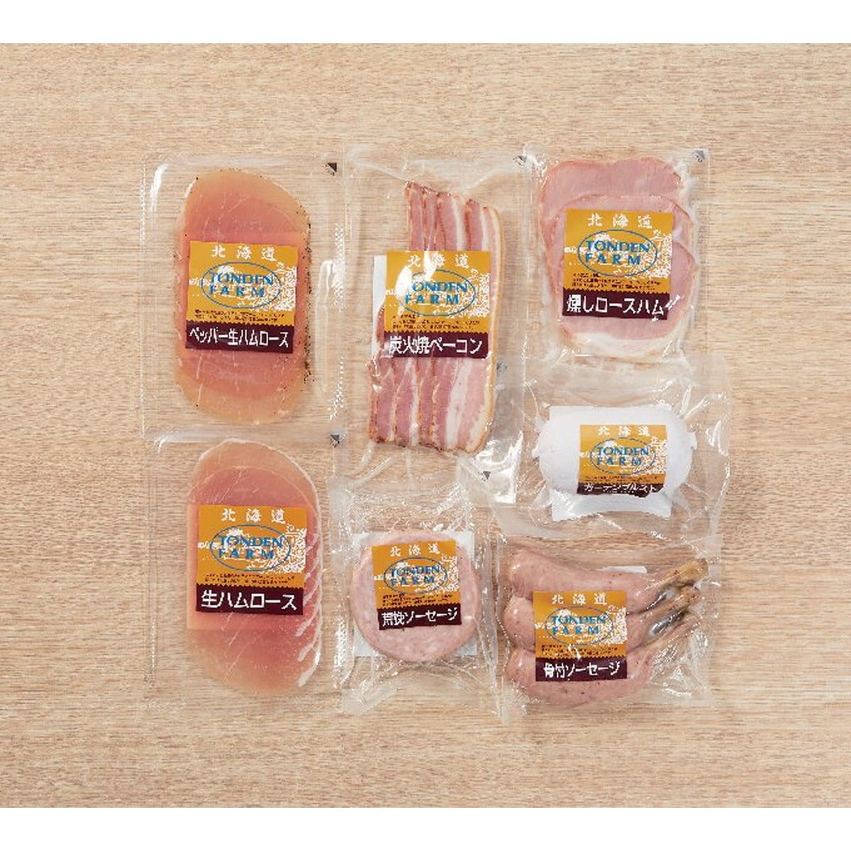 「北海道トンデンファーム詰合せ」 直下式炭火製法でじっくり燻煙して仕上げたハム・ベーコン・ウインナーや、そのままでまろやかな味わいを楽しめる2種類の生ハムなどをバラエティー豊かに詰合わせてお届けします。