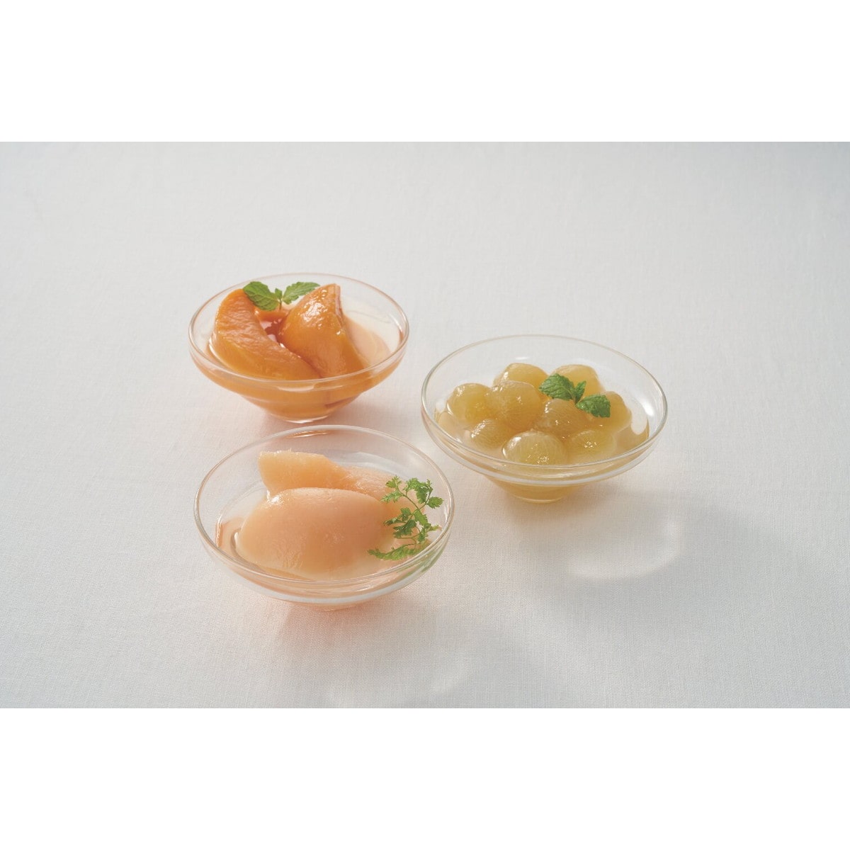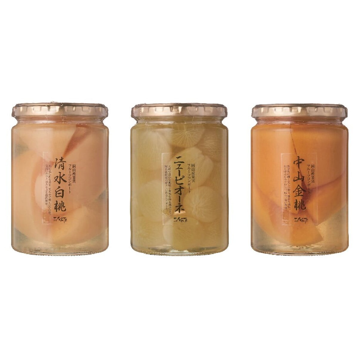 「岡山県産フルーツコンポート」 岡山県産の清水白桃と中山金桃、ニューピオーネのコンポートをセットにしました。岡山の代表的な果物で、とろけるような食感の桃と、酸味と甘みのバランスいいぶどうを楽しめます。