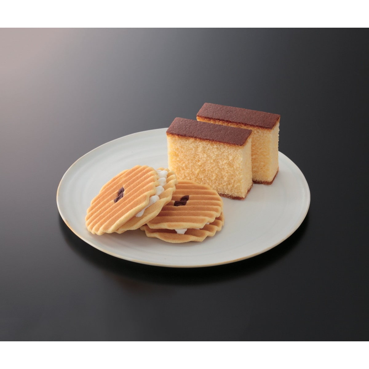 「カステーラ・ヴァッフェル詰合せ」 独自配合の小麦粉、新鮮な卵、美味しさを極めた製法。素材の持つ力で自然に焼き上げたカステーラです。ドイツ風の堅焼きワッフルに、ヴァニラ風味のクリームを挟んだ洋風焼き菓子ヴァッフェルとのお詰合わせです。