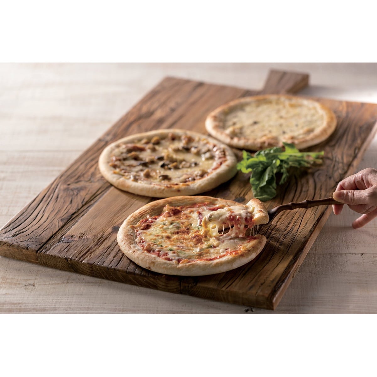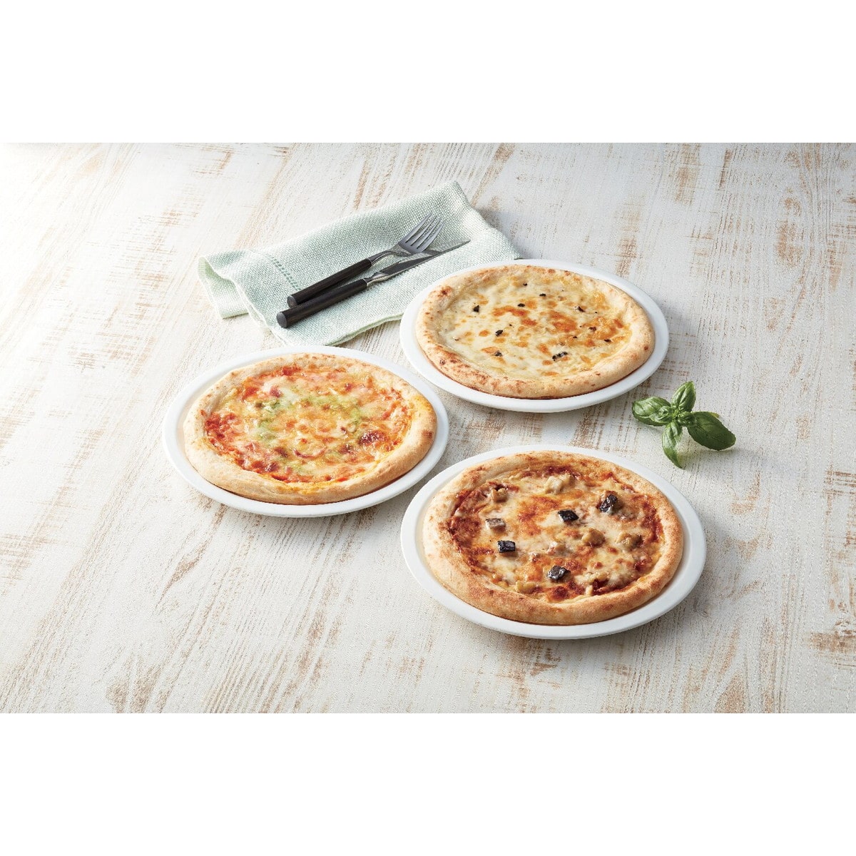 「3種のこだわりナポリ風ピッツア」 ナポリ風クラストに、チーズ数種に黒トリュフを使ったピッツァ。ピリッとスパイシーに仕上げたボロネーゼソースのピッツァ。バジルの香りにこだわったマルゲリータピッツァの3種類のセットです。