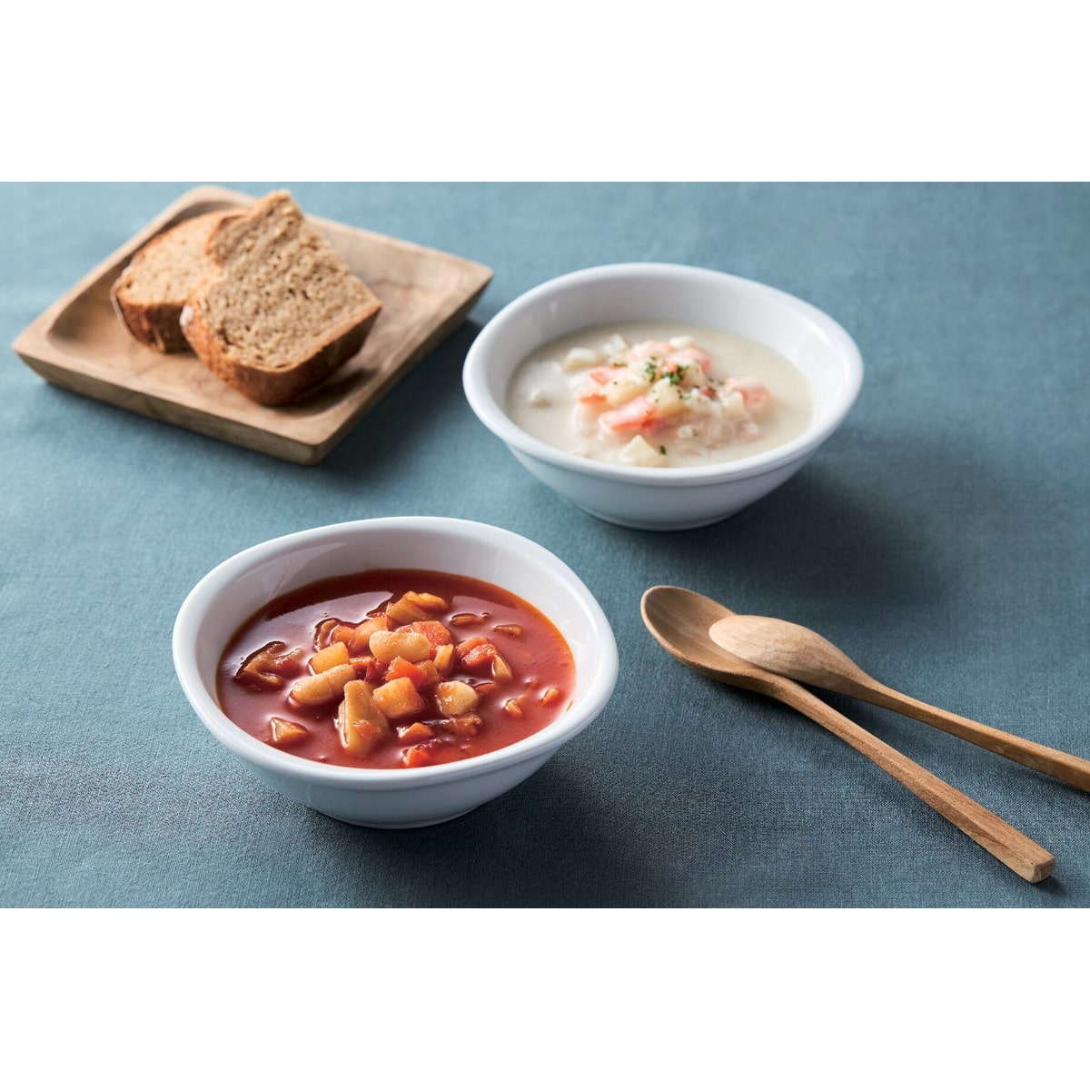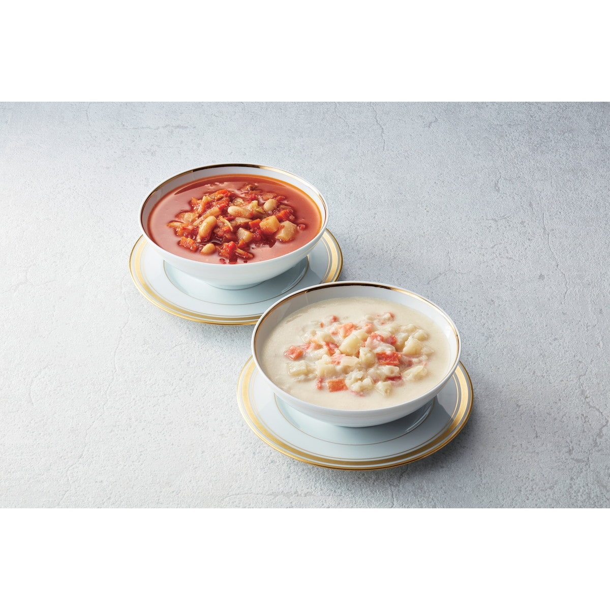 「2種スープ詰合せ」 定番ミネストローネは、白いんげん豆を加えてコクのある味わい。アサリの風味が香るクリーミーなクリームスープは野菜や牛乳の味わいがギュッとつまったお味に。