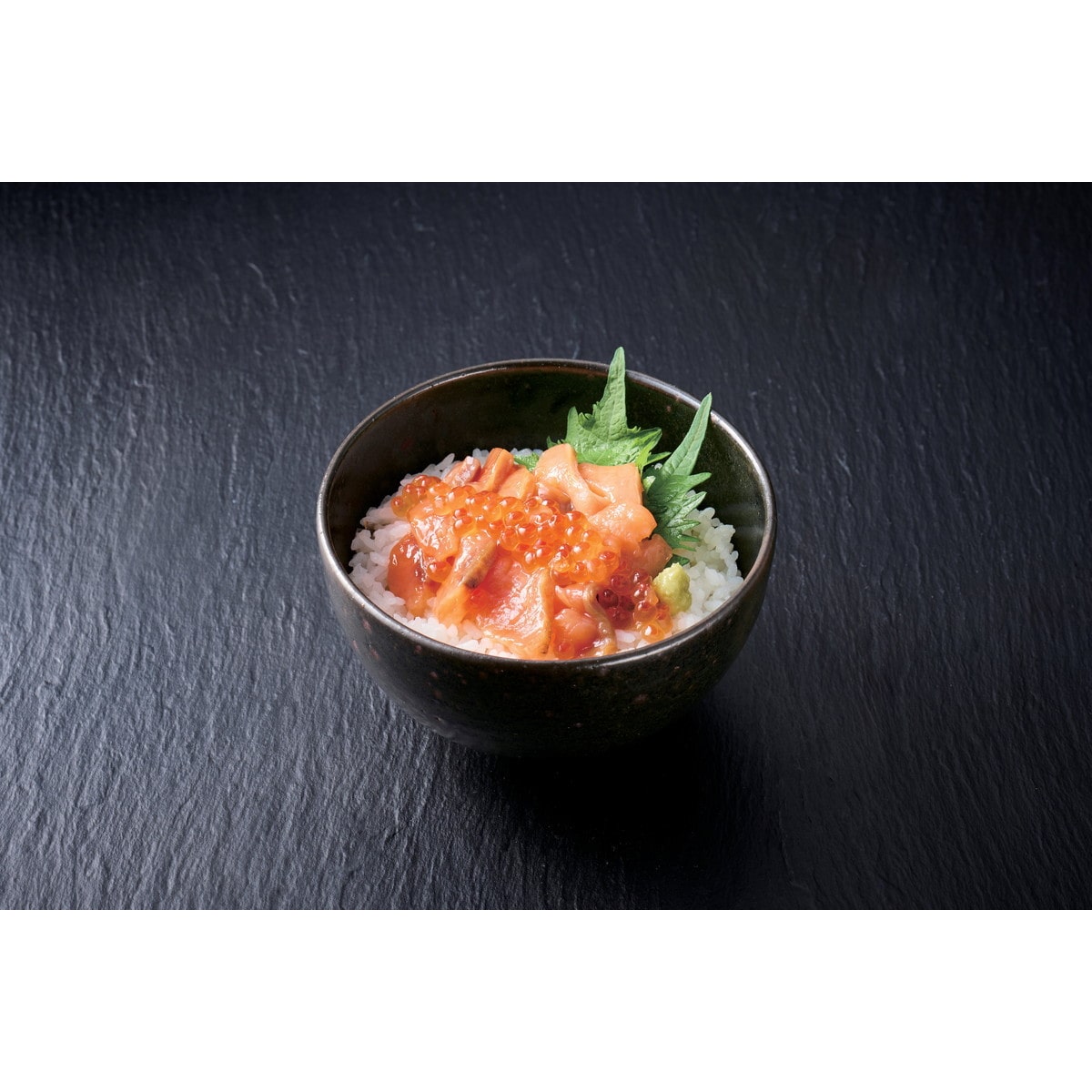 「北海道産 いくら、サーモン親子漬け」 北海道道東近海で水揚げされる鮮度の良い秋鮭といくらを使用しています。身は濃厚な醤油タレに漬けて熟成させました。いくらは甘口の醤油タレで仕上げています。