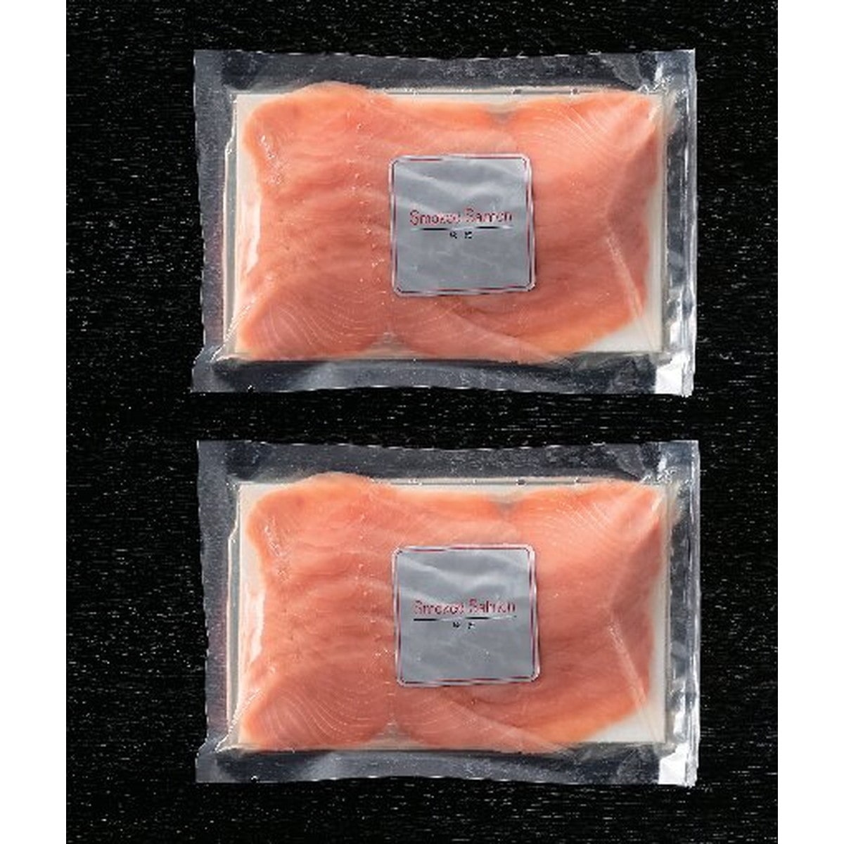 「北海道産秋鮭スモークサーモン 200×2」 北海道産秋鮭を手振り製法で味付けし、三種のチップ(ナラ・ヒッコリー・サクラ)で燻しました。