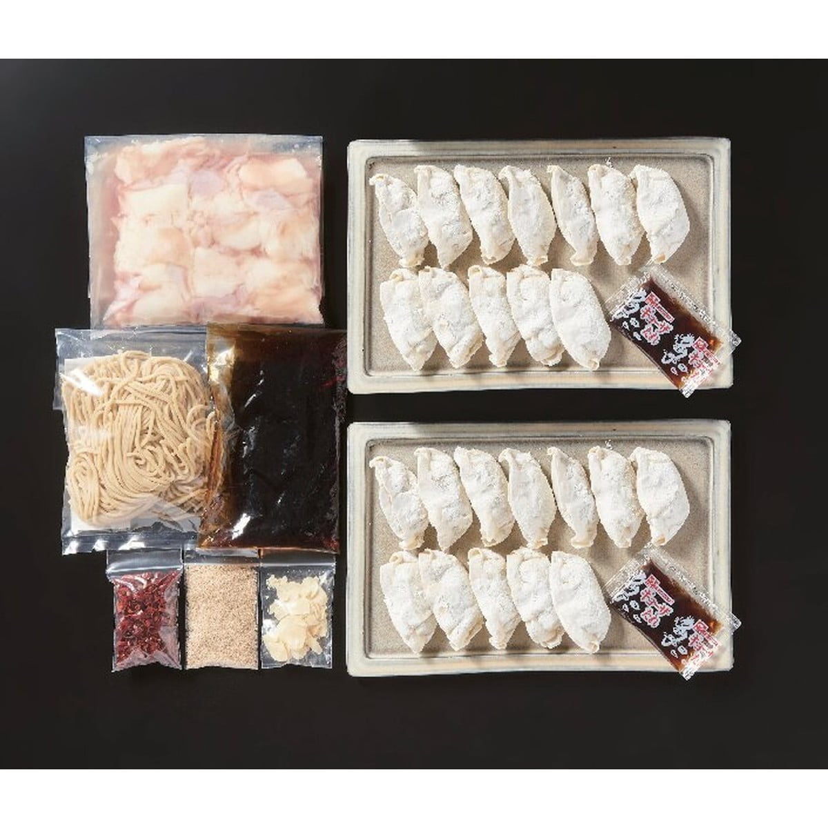 ●数量・内容:もつ鍋セット(和牛もつ200g、もつ鍋スープ135g、薬味(ガーリックスライス・輪切り唐辛子・白ごま各5g)、ちゃんぽん生麺90g)、黒豚餃子(16g×12)×2、たれ13g×2