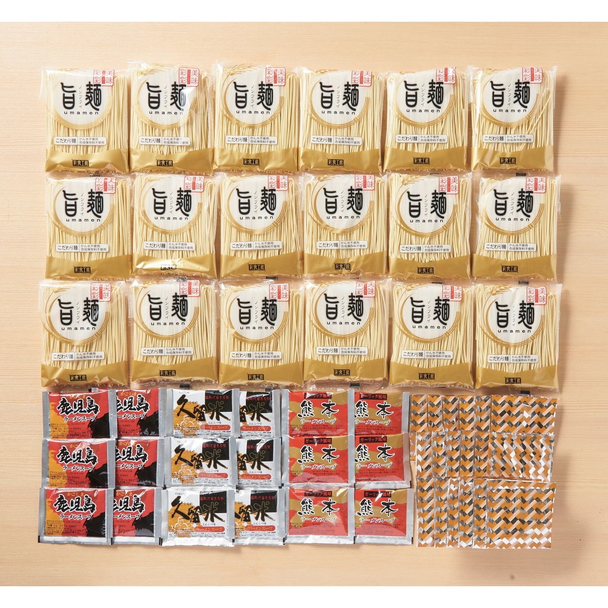 ●数量・内容:麺80g×18、久留米スープ38g・鹿児島スープ35g・熊本スープ40g×各6、ラーメンふりかけ3g×18
