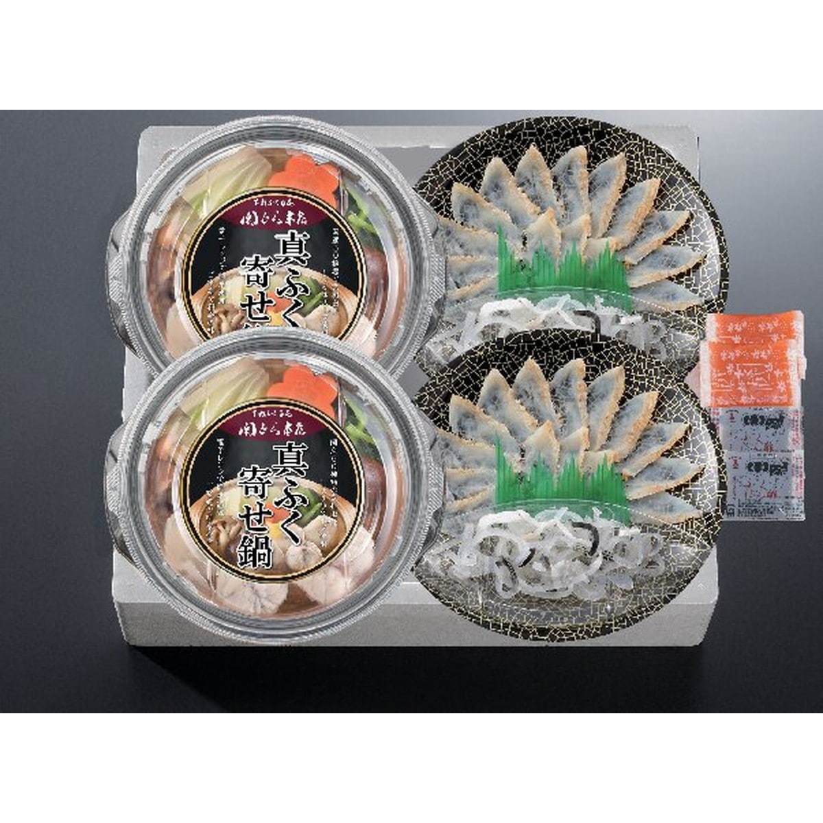 ●数量・内容:真ふぐ寄せ鍋(個食鍋)300g×2、真ふぐたたき刺身(17cm皿)20g×2、とらふぐ皮20g×2、ふくポン酢10g×2、もみじおろし10g×2