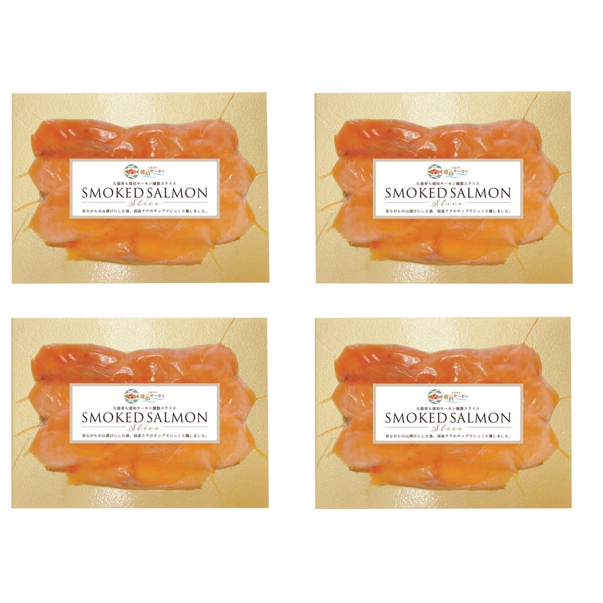 「琥珀サーモン燻製スライス(久慈育ち) 60g×4」 岩手県のブランドサーモン「久慈育ち琥珀サーモン」を昔ながらの山漬けにした後、国産ナラのチップで、じっくり燻しました。なめらかでもっちりとした食感をお楽しみいただけます。