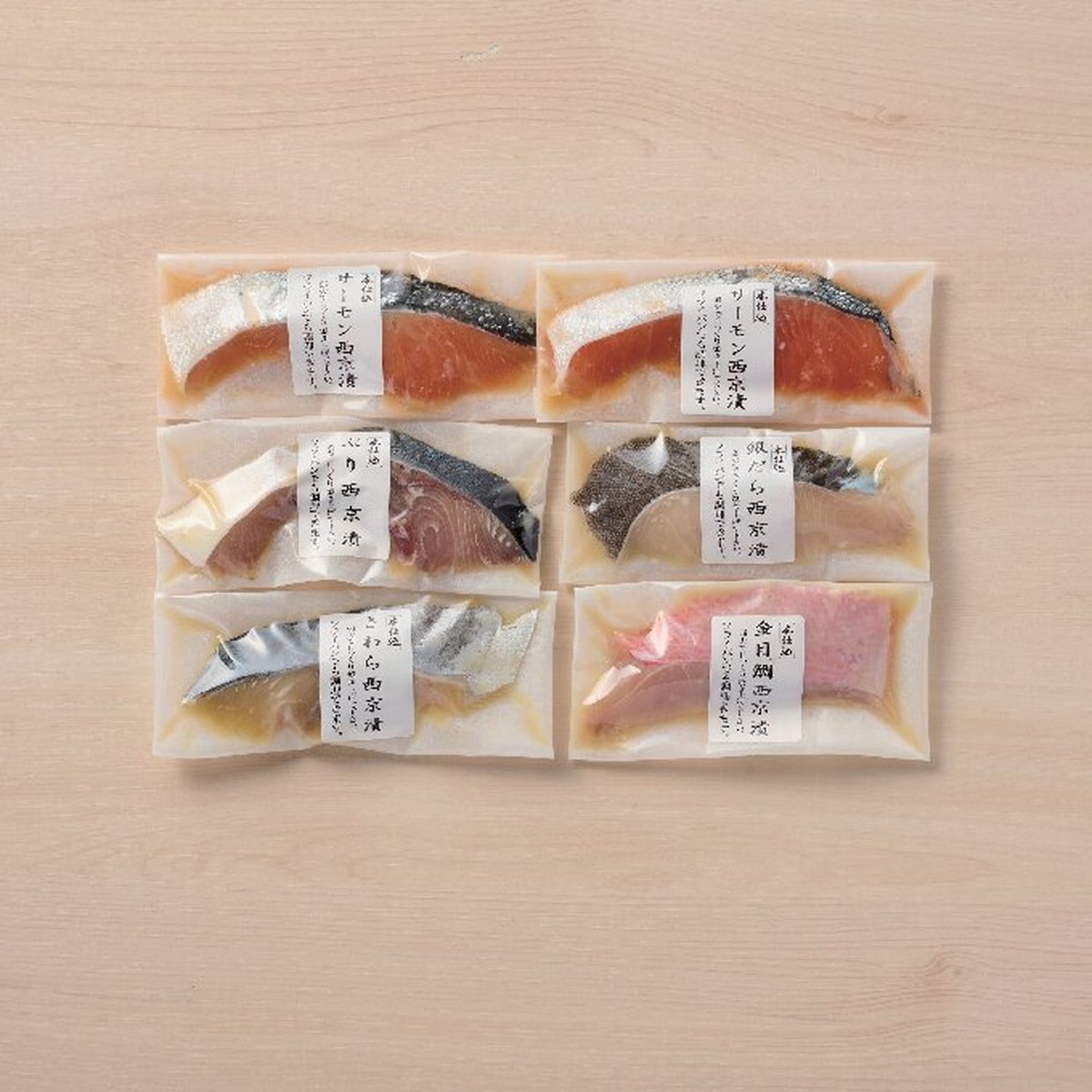 「漬魚詰合せ サーモン2/ブリ・キンメ・サワラ・ギンダラ」 人気の魚を西京味噌で漬け込みました。焼きやすいよう、味噌を落としてあります。