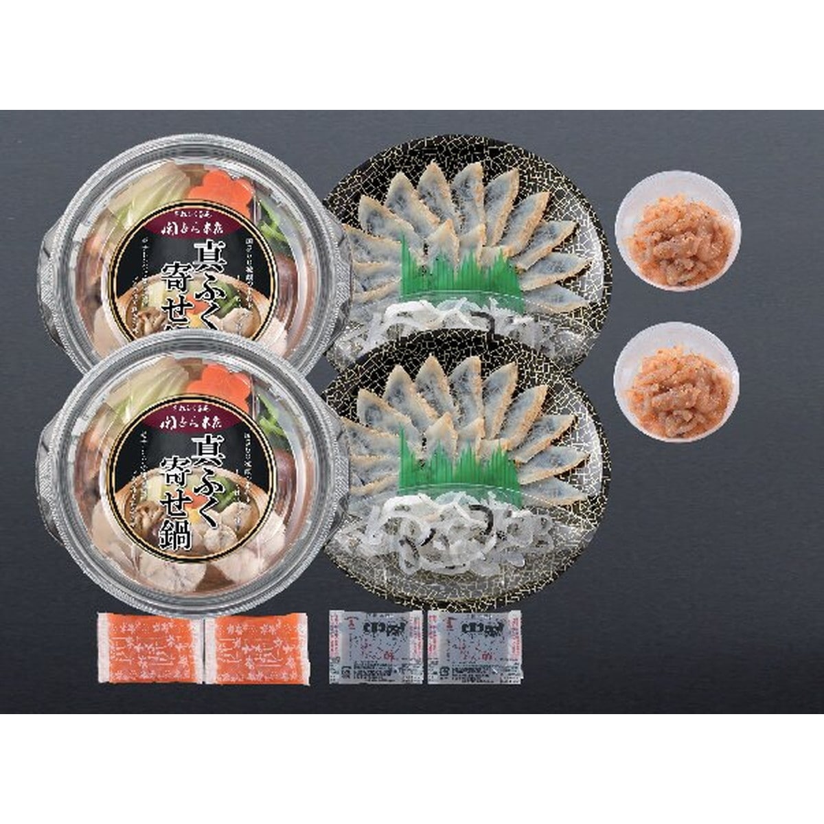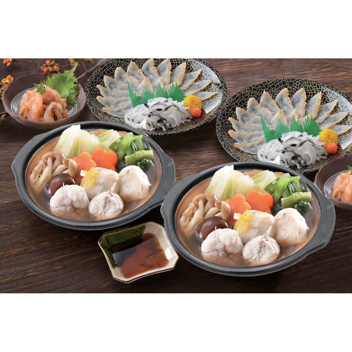 「ふぐたたき刺身とふぐ個食鍋セット」 ふぐの本場下関の職人による「真ふぐのたたき刺身」と、電子レンジで簡単調理寄せ鍋を詰合わせた真ふぐ満喫セットです。