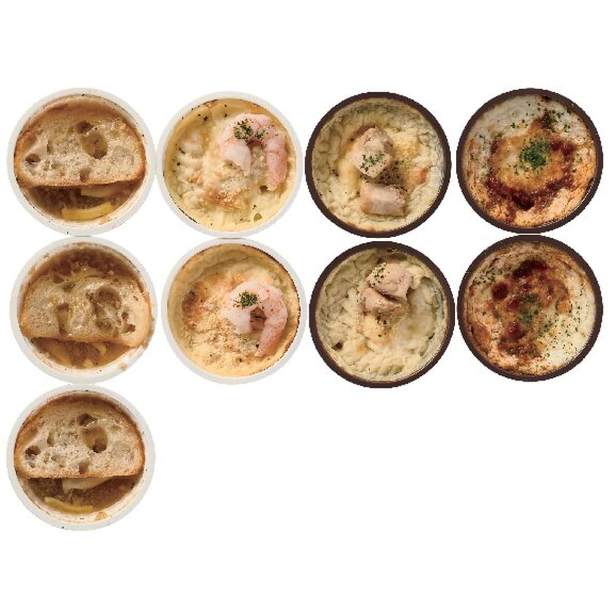 ●数量・内容:エビとフジッリのグラタン・チキンとフジッリのグラタン各130g×2、ミートソースドリア145g×2、オニオングラタンスープ130g×3