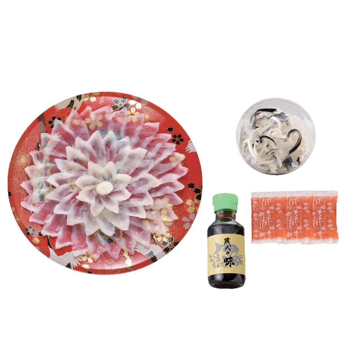 ●数量・内容:とらふぐ刺身(22cm皿)65g、とらふぐ皮30g、ふくポン酢100ml、もみじおろし10g×3
