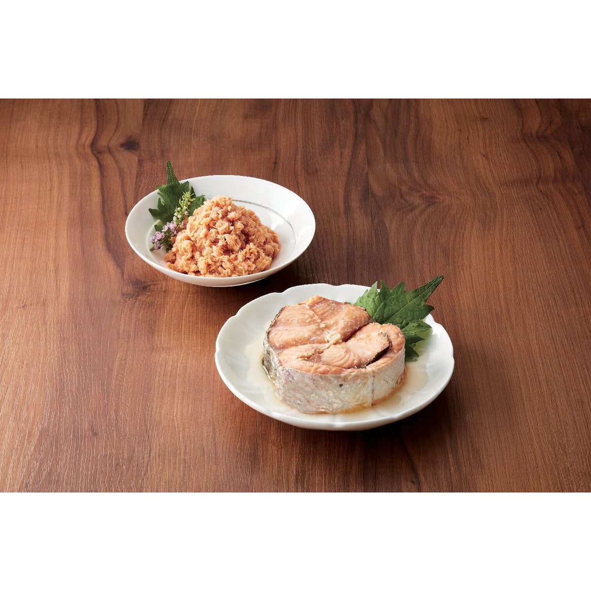 「アラスカ産 紅鮭缶詰セット」 マイルドな脂をもちつつほどよく締まったアラスカ産紅鮭を、使い勝手の良い2種類の缶詰にしました。