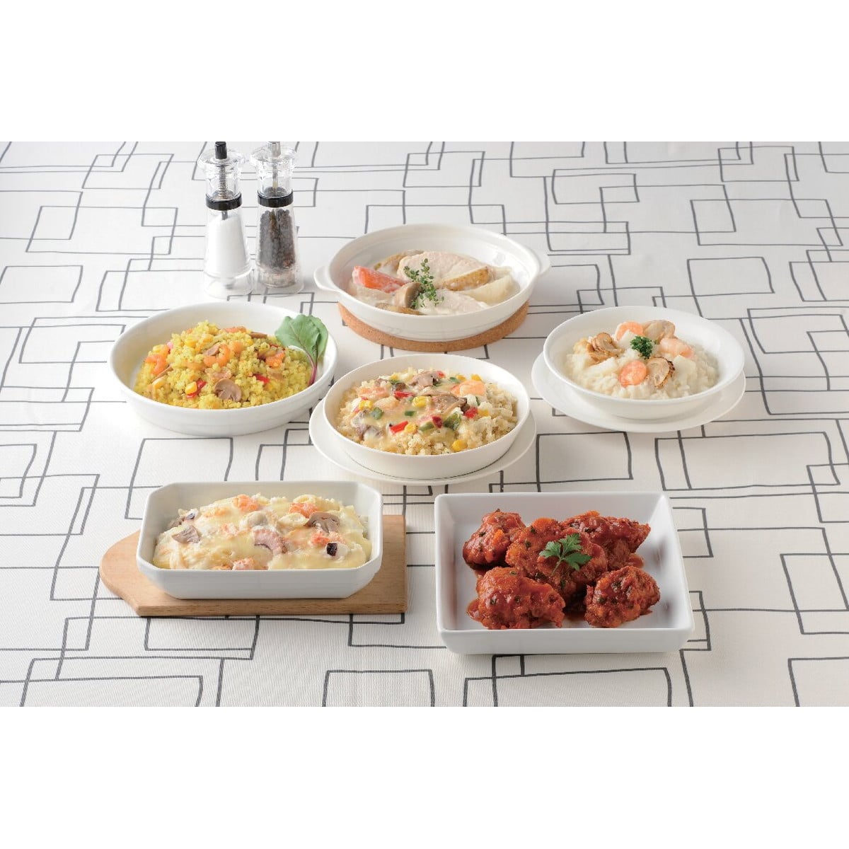 「キッチンのお惣菜 シーフード&チキン」 お子様から大人まで人気の電子レンジで温めるシーフードとチキンのお惣菜。ソースがまろやかでクリーミー熱々が美味しいシーフード料理の定番、ドリアやグラタンなどにチキンを使用した煮込み料理をセットにしました。