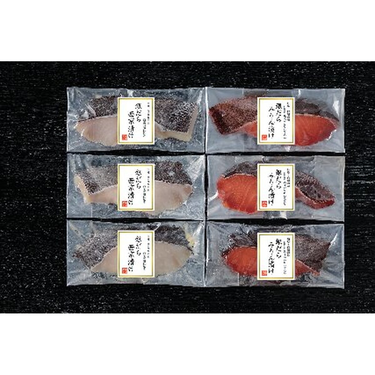 「銀ダラ西京漬・味醂漬詰合せ 鱈西70×3/鱈味70×3」 繊細で柔らかな身の舌触り、口いっぱいに広がる脂の旨みが人気の銀ダラ。京都の老舗『関東屋』の西京味噌を使った上品な西京漬と本格みりん漬の詰合わせです。