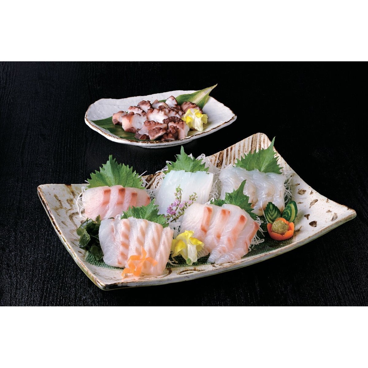 「柵造り盛合せ イカ・ヒラマサ・タイ・クエ各100g、タコ味噌漬200g」