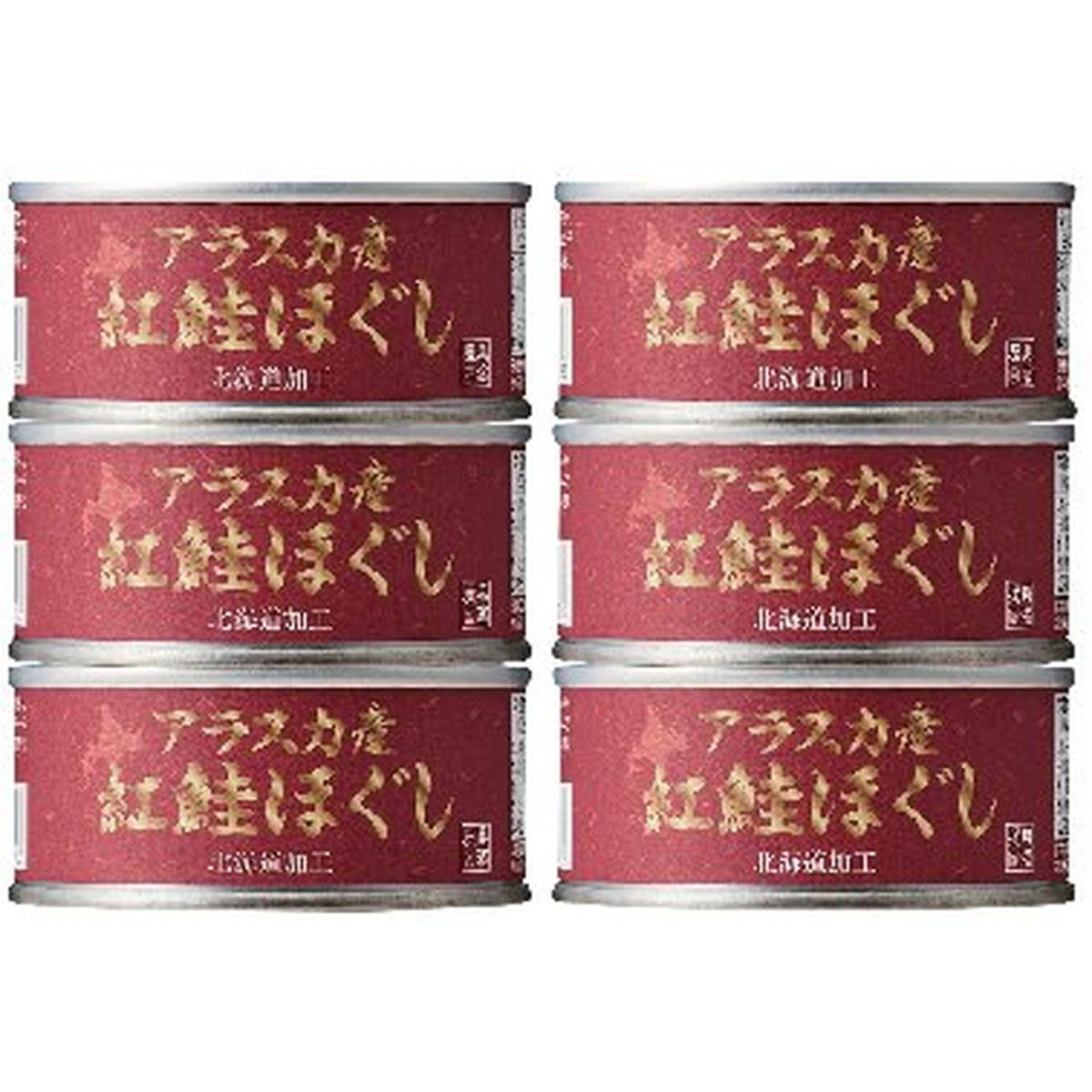 「アラスカ産 紅鮭ほぐし缶詰」 脂ののったアラスカ産紅鮭を調理し骨や皮を取りのぞいて丁寧に手ほぐしした缶詰。ほんのり塩味が紅鮭の旨みを引き立てています。