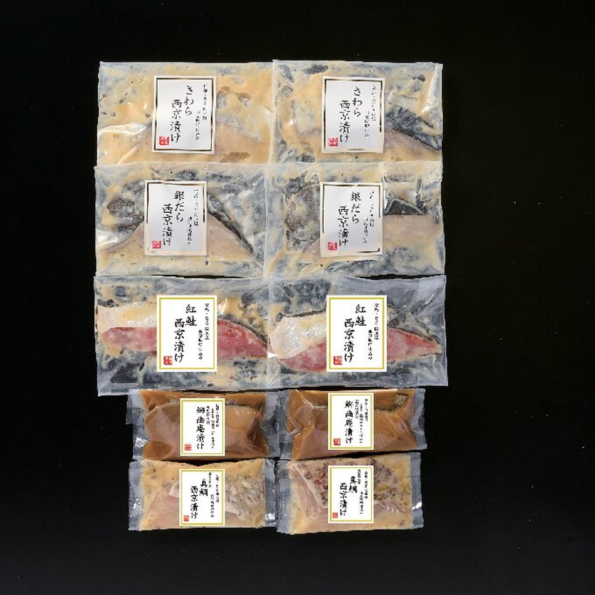 ●数量・内容:銀鱈西京漬70g×2、さわら西京漬70g×2、紅鮭西京漬70g×2、真鯛西京漬60g×2、ぶり幽庵漬70g×2