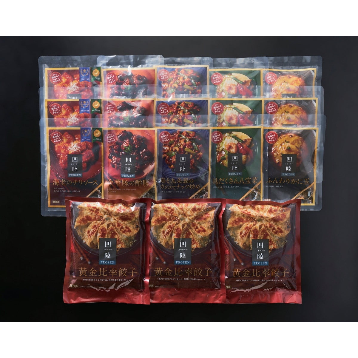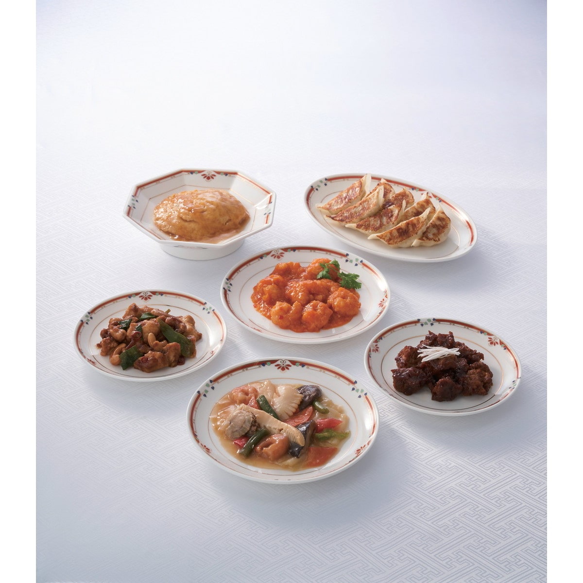 ●数量・内容:海老のチリソース・金華豚の酢豚・鶏と九条葱のカシューナッツ炒め150g×各3、具だくさん八宝菜170g・ふんわりかに玉185g・黄金比率餃子180g×各3