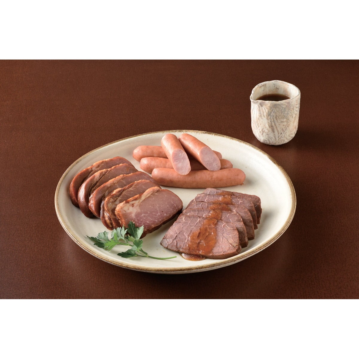 ●数量・内容:特選ロースハム320g、ローストビーフ200g×2、ローストビーフソース40g×2、特選肩ロース180g、やわらか焼豚185g、生ハム45g、特選燻しポークハム180g、あらびき燻しウインナー80g