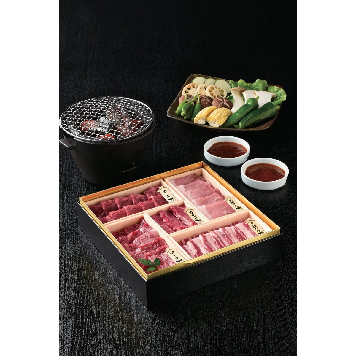 「黒毛和牛・黒豚焼肉用詰合せ御膳 150g×4/80g×1」 料理店さながらに鹿児島県産黒毛和牛と黒豚の様々な部位が味わえる焼肉御膳セットです。希少な部位も含めバラエティー豊かな美味しさが楽しめる贅沢なセットです。