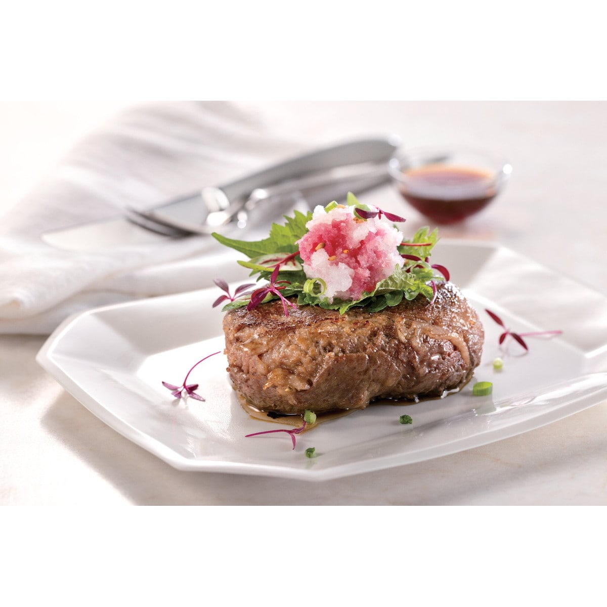 「黒毛和牛ディナーハンバーグ 150×9/ソース×9」 粗挽きのハンバーグをしゃぶしゃぶ薄きり肉で包んだ肉巻きハンバーグです。鹿児島県産黒毛和牛を使用したコクと旨みたっぷりのハンバーグです。