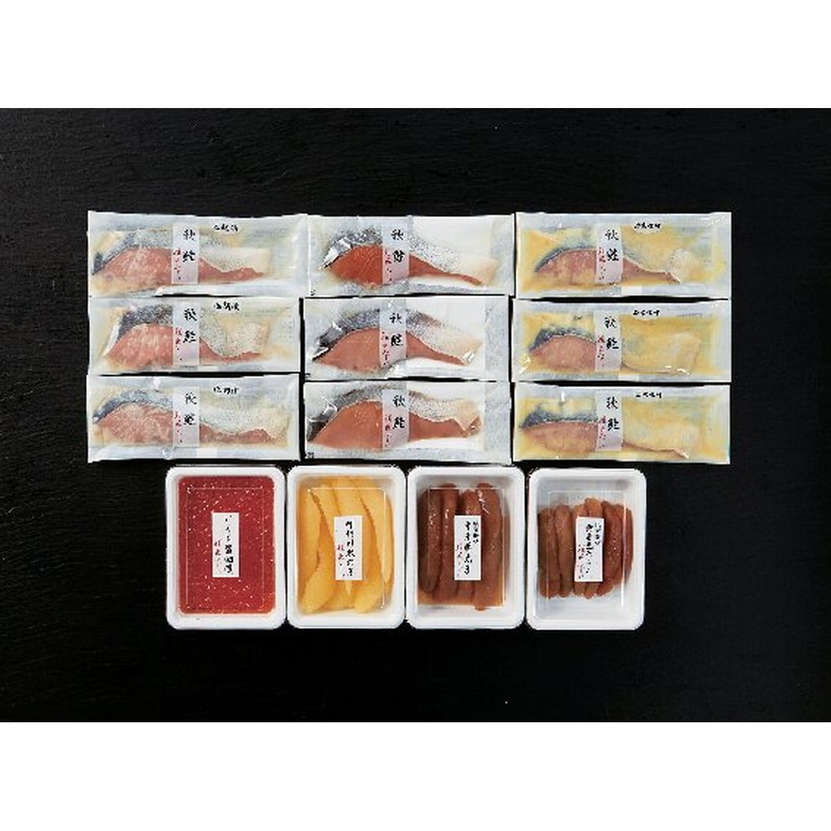 ●数量・内容:塩秋鮭×3、秋鮭西京味噌漬・秋鮭塩麹漬60g×3、いくら醤油漬け・味付数の子・塩たらこ(無着色)・辛子明太子(無着色)各150g