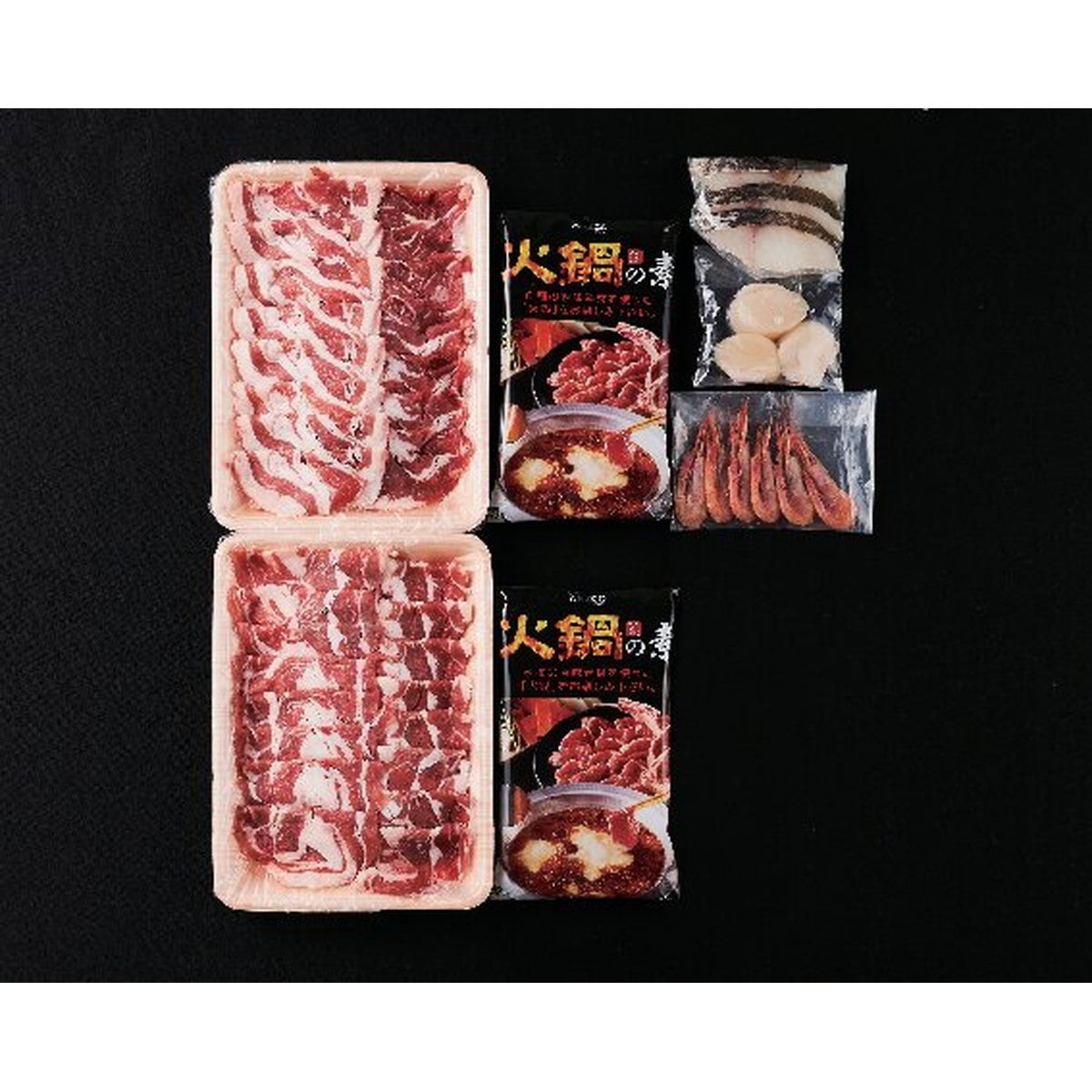 ●数量・内容:ラム肉ショルダーしゃぶしゃぶ用500g×2、甘海老60g×1、ほたて貝柱(3入)×1、鱈(3切)×1、火鍋スープの素(2~3人前)150g×2
