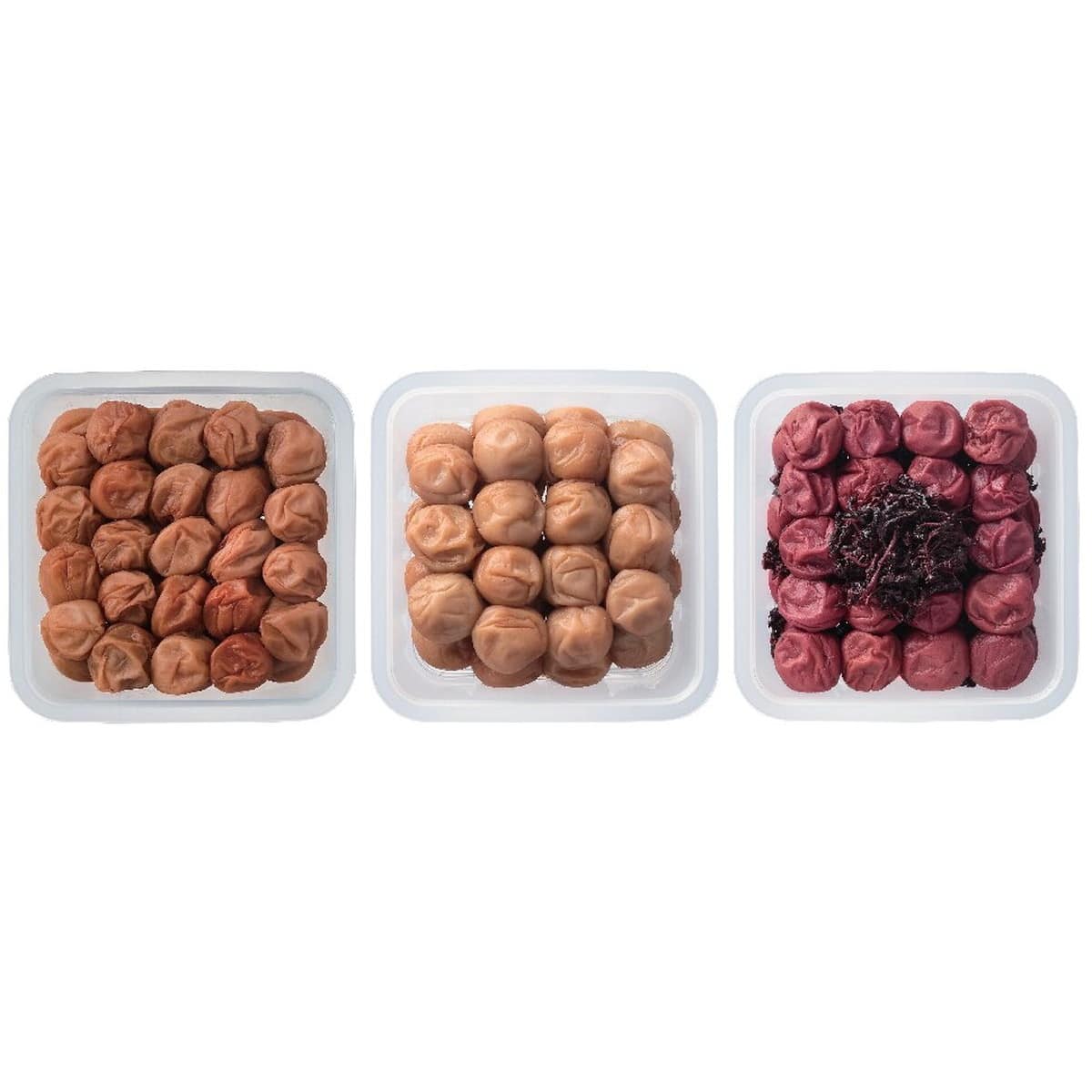 ●数量・内容:ハチミツ入梅干800g(2~5L粒)塩分約7%、まろやか梅800g(2~4L粒)塩分約10%、うす塩味しそ漬梅干800g(梅干720g、しそ葉80g)2~5L粒、塩分約8%