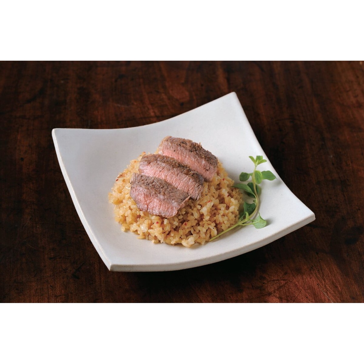 「土佐あか牛ステーキガーリックライス」 ガーリックの風味が効いたご飯の上に、あか牛のステーキを食べやすくカットしてのせています。電子レンジで温めるだけで簡単にお召し上がりいただける一品です。