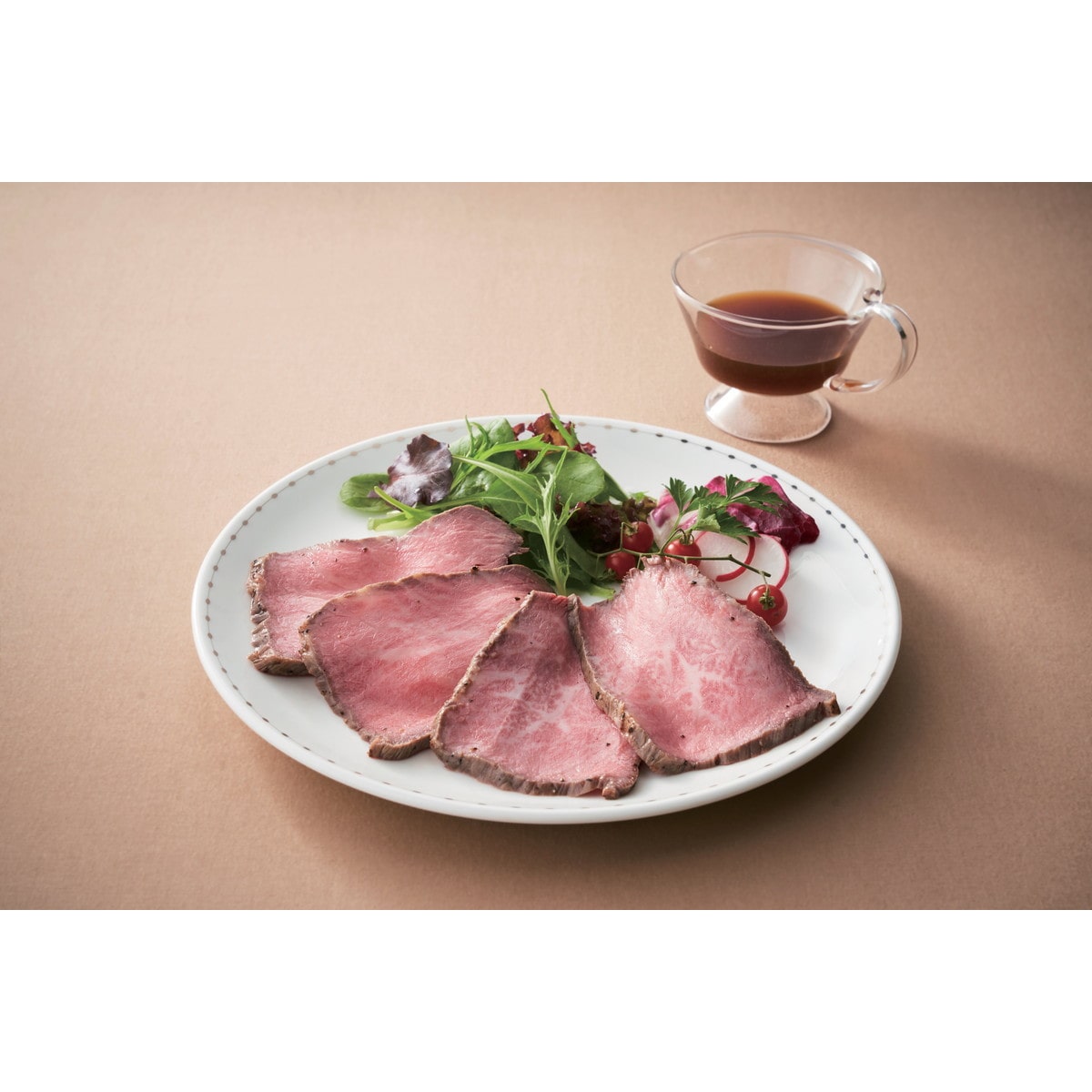 「黒毛和牛ローストビーフ」 黒毛和牛の柔らかい牛もも肉を時間をかけて調理し、旨味を引き出しました。