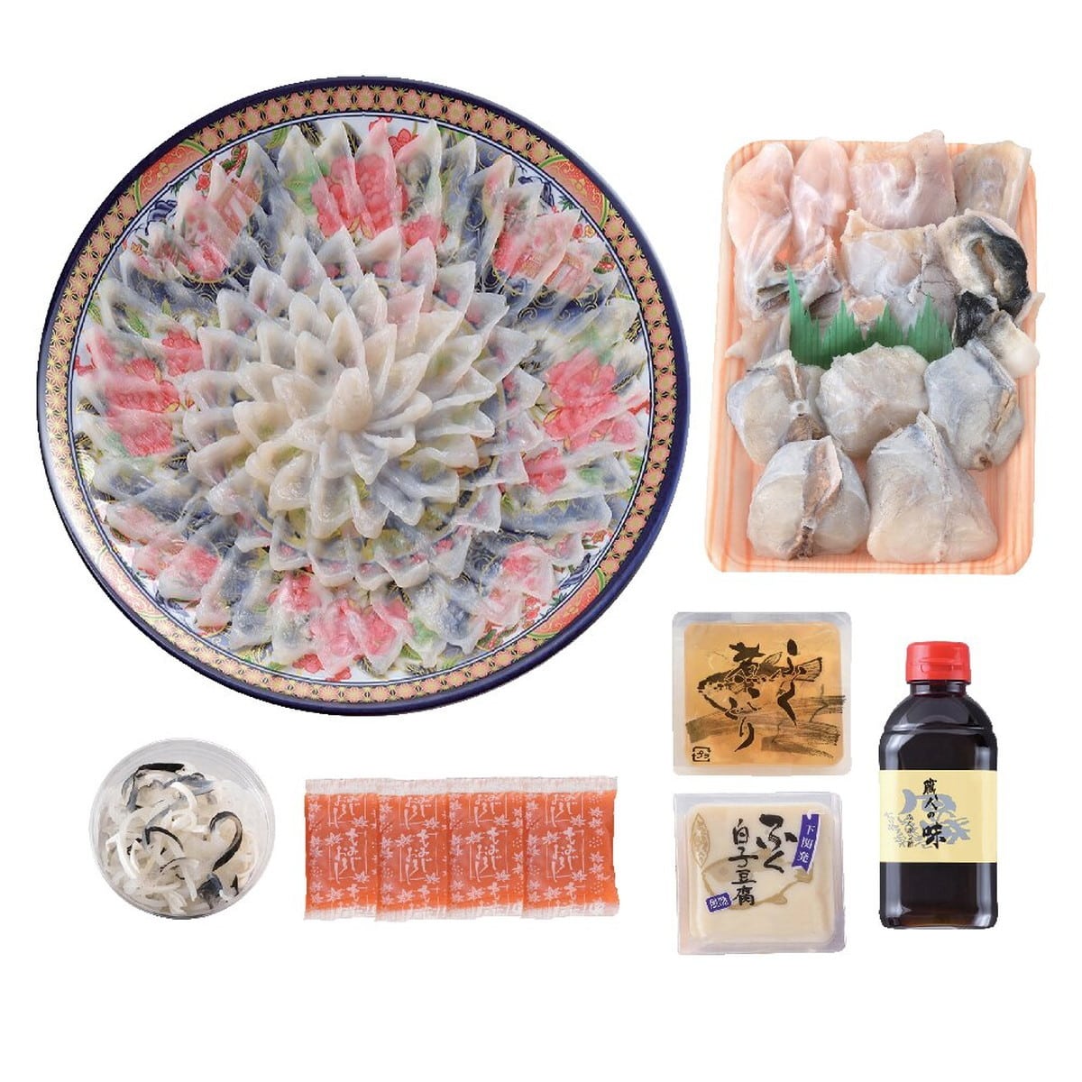 ●数量・内容:とらふぐ刺身(30cm皿)110g、とらふぐ皮60g、とらふぐちり(切身、アラ)300g、ふぐ白子豆腐130g、ふぐ煮こごり100g、ふくポン酢180ml、もみじおろし10g×4
