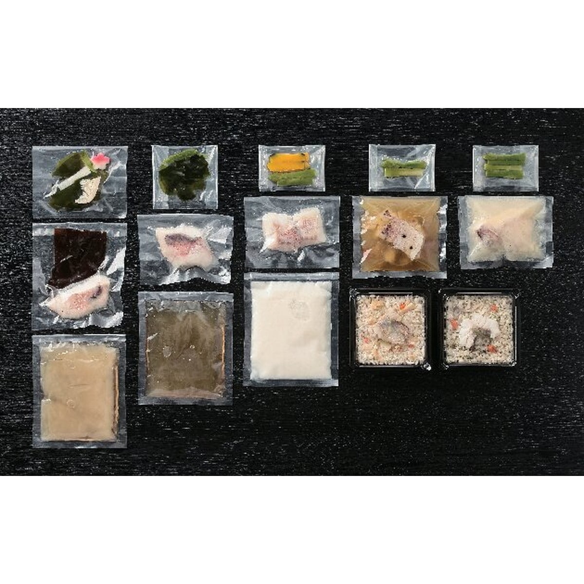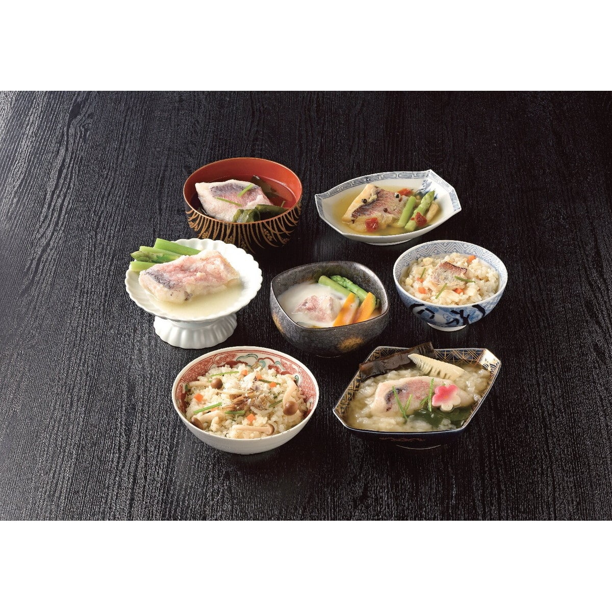 ●数量・内容:甘鯛と季節野菜の吸い物(甘鯛35g、出汁150g、湯通しわかめ・みつば)、甘鯛炊き込みごはん・甘鯛のリゾット各180g、甘鯛酒蒸し野菜あんかけ(甘鯛35g(昆布付)、あんかけ出汁150g、湯通し筍・梅麩・みつば)、甘鯛とかぼちゃのクリームスープ(甘鯛35g、クリームスープ100g、ボイル南瓜・アスパラ)、甘鯛とアスパラのワインソース(レモン風味)焼き(甘鯛とワインソース60g、ボイルアスパラ)、甘鯛のアクアパッツア(甘鯛とアクアパッツアソース180g、ボイルアスパラ)