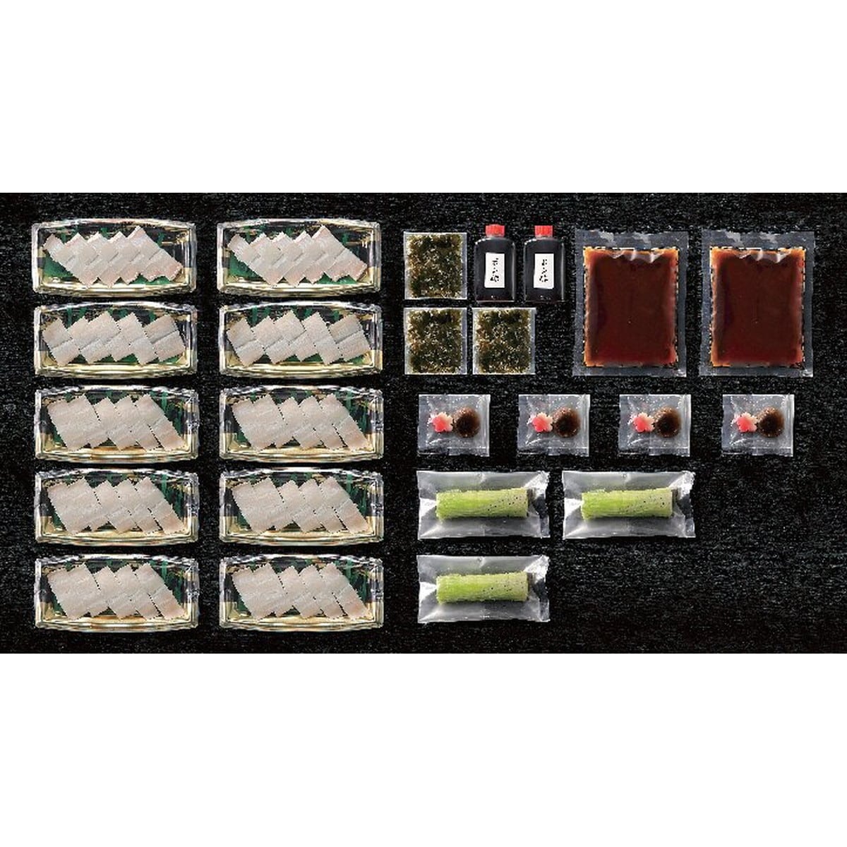 ●数量・内容:鱧切身50g×10、ボイル白菜巻き(ほうれん草・人参入)×3、湯通しわかめ20g×3、生麩としいたけ×4、スープ250g×2、ポン酢80g×2